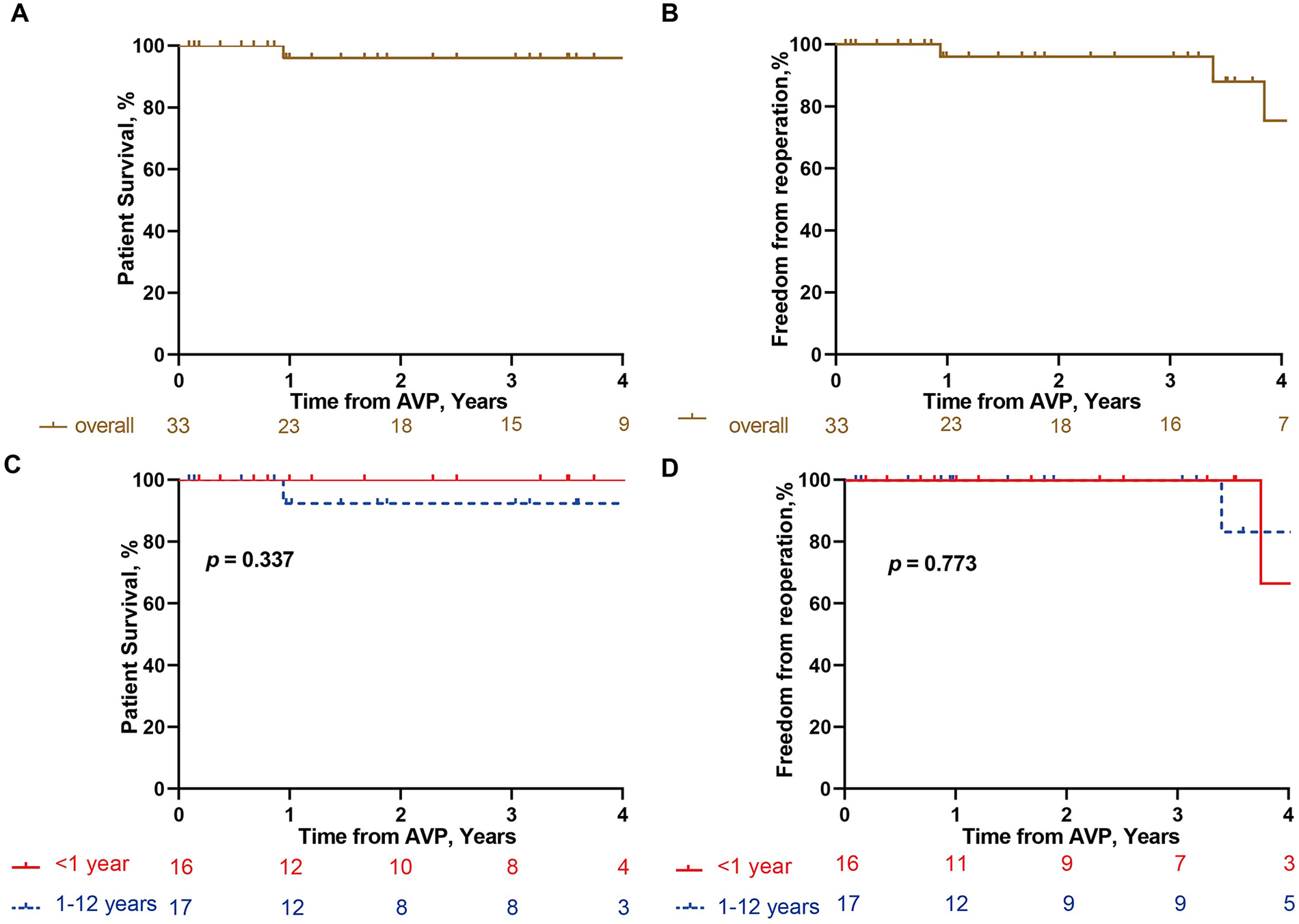 Kaplan–Meier analysis of follow-up outcomes. Kaplan–Meier curves showing overall survival in overall cohort (A) and different age groups (≤1 year vs. >1 year) (C), and freedom from reoperation in overall cohort (B) and different age groups (≤1 year vs. >1 year) (D) Analyses were performed based on 33 patients with follow-up data.