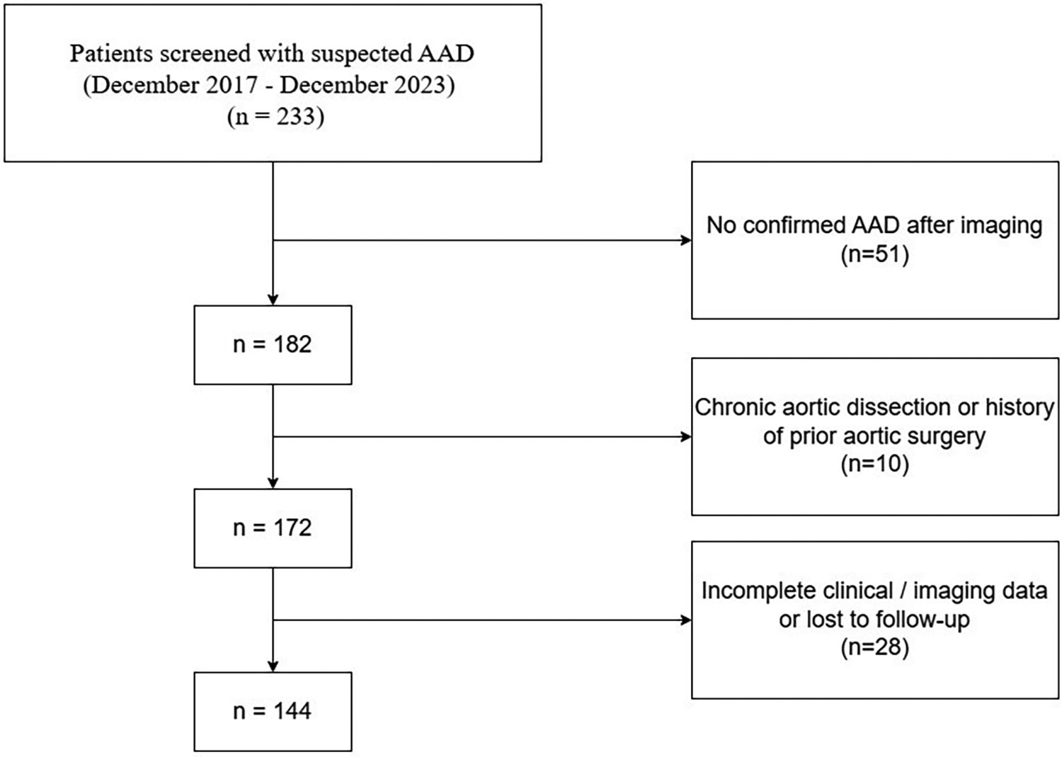 This retrospective cohort study was conducted at Henan Chest Hospital between December 2017 and December 2023. During this period, 233 consecutive patients with suspected acute aortic dissection (AAD) were initially screened. After diagnostic imaging, 51 patients were excluded due to the absence of AAD confirmation by computed tomography angiography (CTA). Among the remaining patients with confirmed AAD, 10 were further excluded because of chronic aortic dissection or a history of prior aortic surgery, and 28 were excluded owing to incomplete clinical or imaging data or loss to follow-up. Ultimately, 144 patients with confirmed acute aortic dissection were included in the final analysis. The diagnosis of AAD was established using CTA in accordance with established diagnostic criteria.
