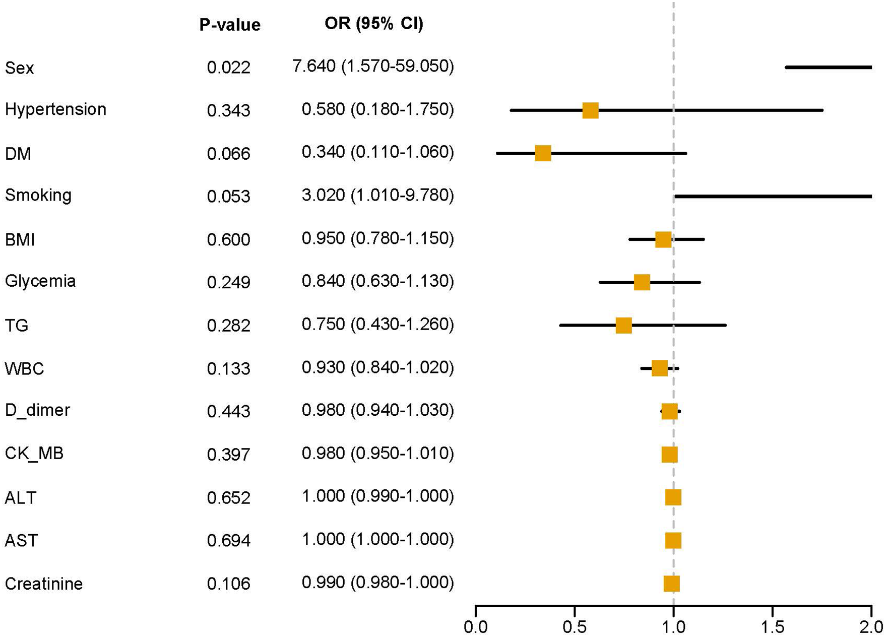 Variables showing significant differences in baseline characteristics were entered into multivariate logistic regression analysis. Figure 2 displays the forest plot of multivariate analysis results. After adjusting for potential confounders, male sex remained an independent predictor of MACCEs with an odds ratio of 7.640 (95% CI: 1.570–59.050, p = 0.022). Smoking showed a marginally significant association (OR = 3.020, 95% CI: 1.010–9.780, p = 0.053).