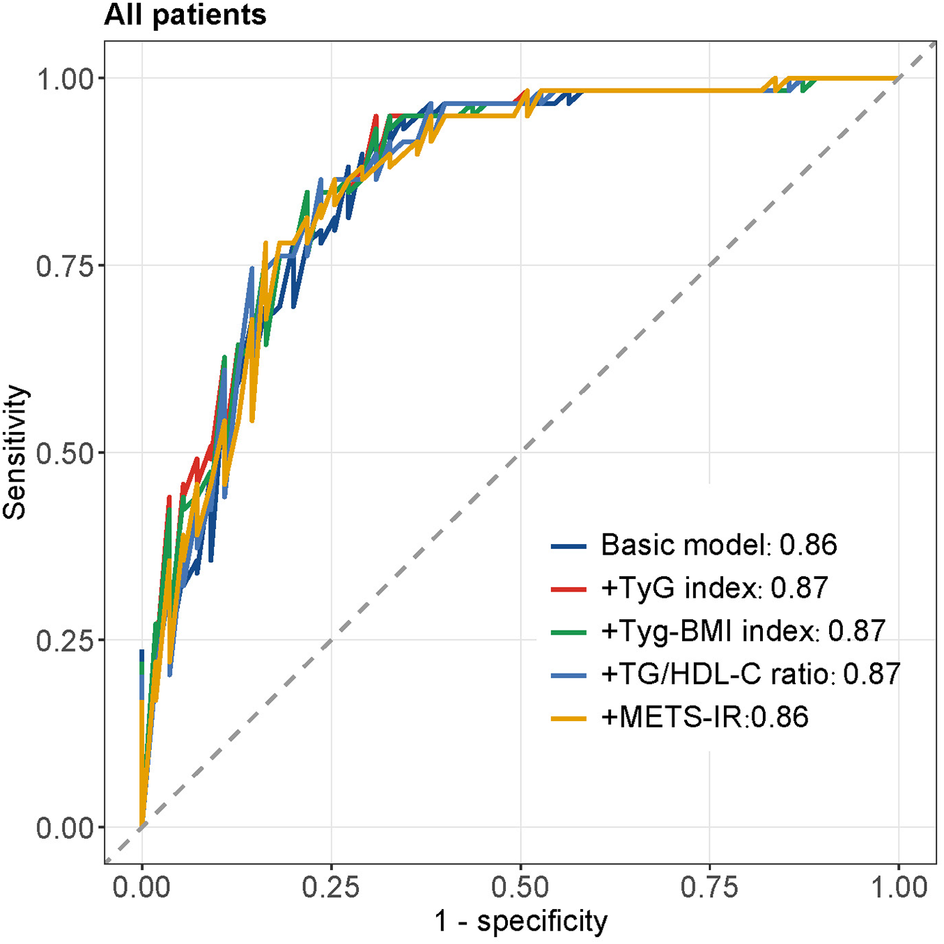 Figure 3 displays the ROC curves for different insulin resistance indices in predicting MACCEs in all patients. The basic model (AUC = 0.86) incorporating traditional cardiovascular risk factors demonstrated good discriminative ability. Adding TyG index (AUC = 0.87), TyG-BMI index (AUC = 0.87), TG/HDL-C ratio (AUC = 0.87), or METS-IR (AUC = 0.86) to the basic model showed comparable predictive performance, with the curves closely overlapping. Figure 4 presents subgroup ROC analyses, revealing similar patterns in male patients (Figure 4A), hypertension patients (Figure 4B), diabetes mellitus patients (Figure 4C), and smoking patients (Figure 4D), with all indices showing acceptable discriminative ability for predicting MACCEs in these specific populations.