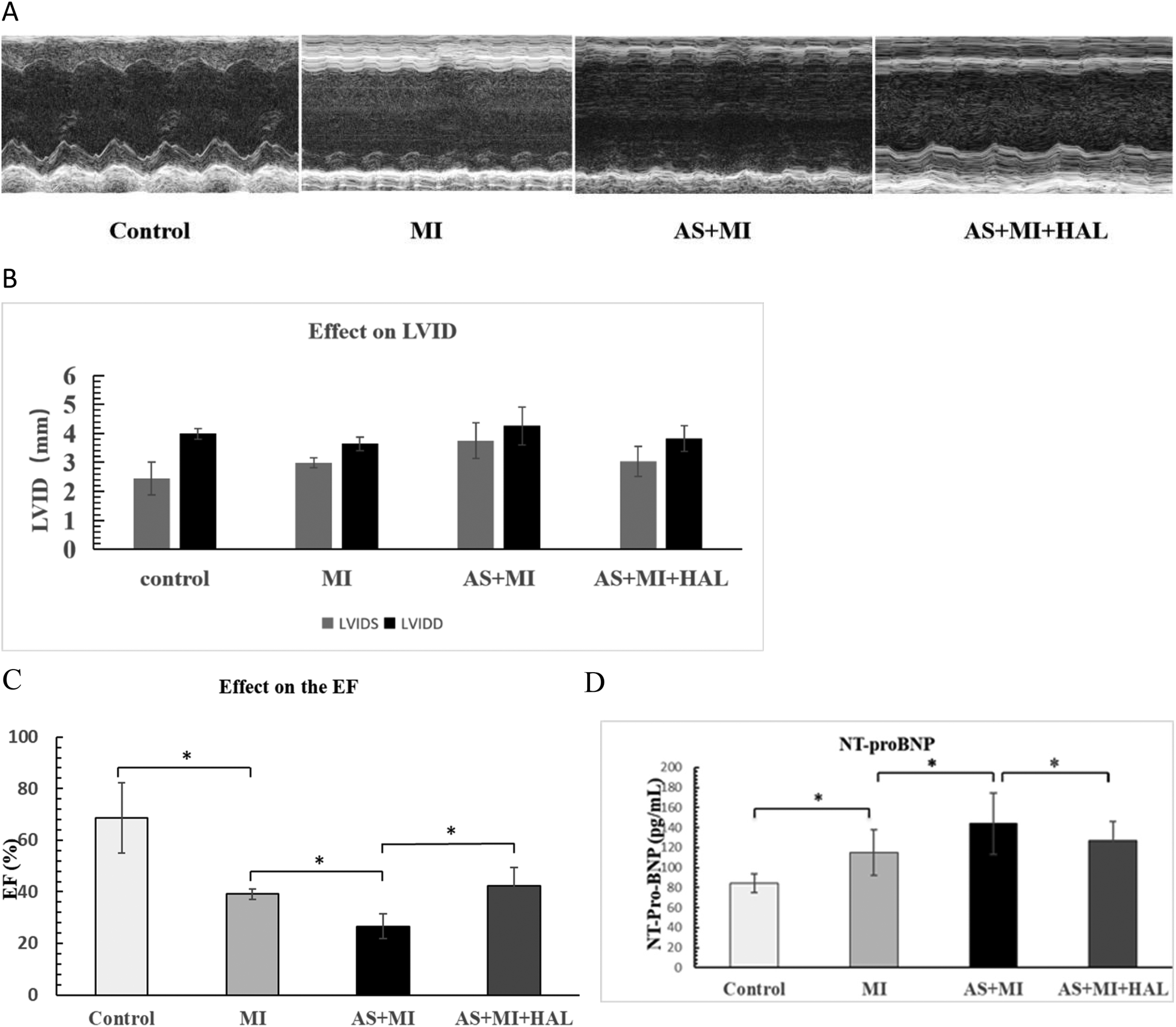 (A) AS significantly aggravated cardiac remodeling and dysfunction after MI, and HAL improved cardiac function. M-mode ultrasound imaging of left-ventricular structure. (B) Left ventricular internal dimensions post-MI. (C) Changes in ejection fraction (EF). (D) Serum NT-proBNP levels. Values are mean ± SEM (n = 6). *p < 0.05.