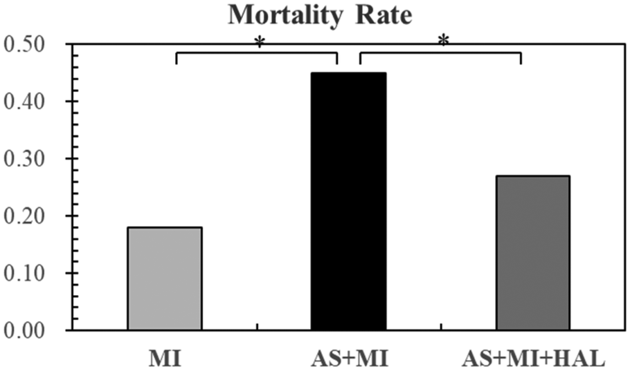 AS increased post-MI mortality risk, and HAL treatment reduced mortality. Values are mean ± SEM (n = 11). *p < 0.05.