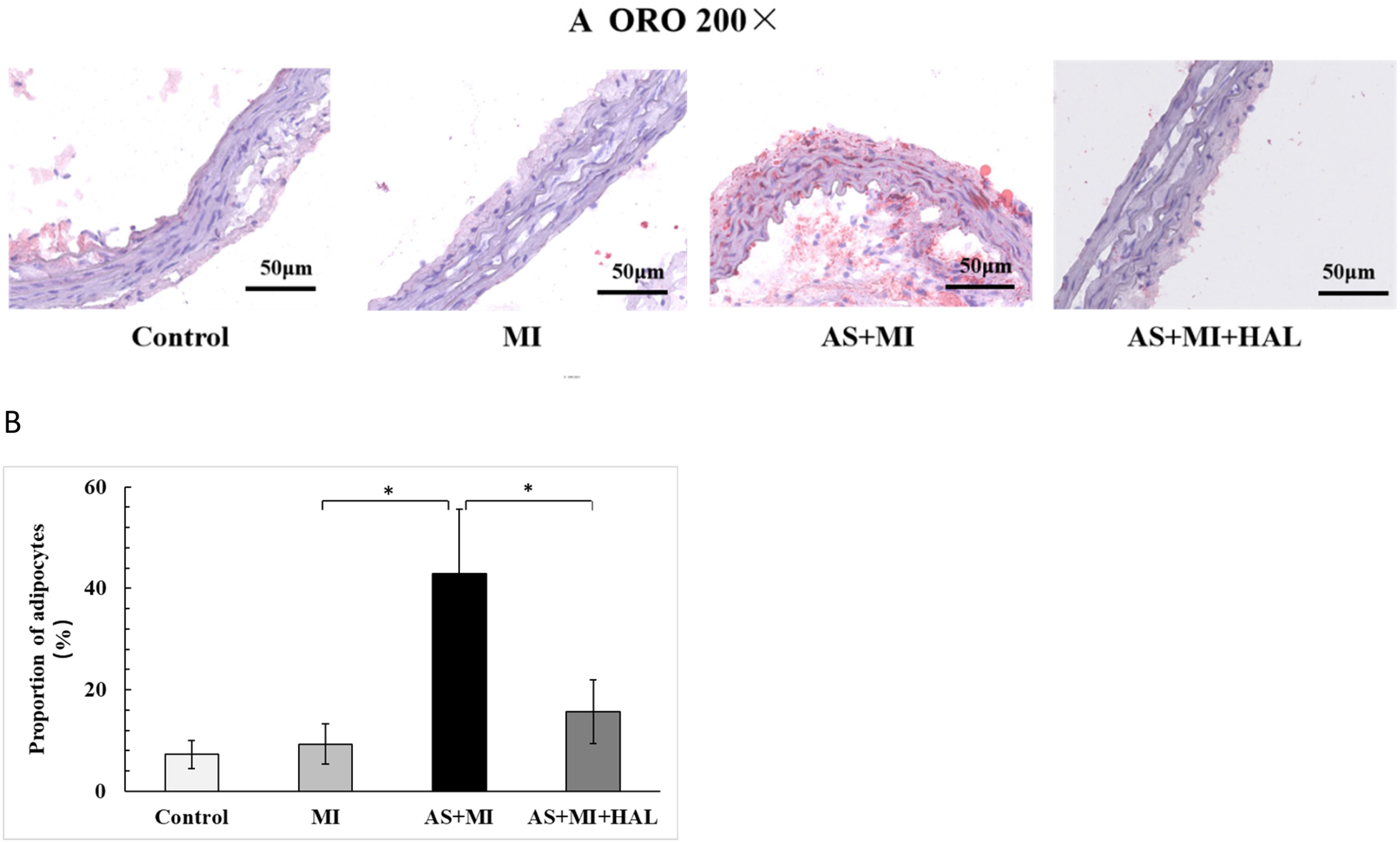In our previous experiments, lipid-laden plaques were observed throughout the aortic tissue in the AS model group following 24 weeks of HFD feeding (17). The same result was obtained in this experiment. To evaluate the lipid content within atherosclerotic plaques, ORO staining was performed (Figure 3). The HFD markedly promoted lipid accumulation, as evidenced by an increased percentage of adipocyte area. In contrast, HAL treatment led to a substantial reduction in lipid deposition, indicating attenuation of atherosclerotic plaque formation.