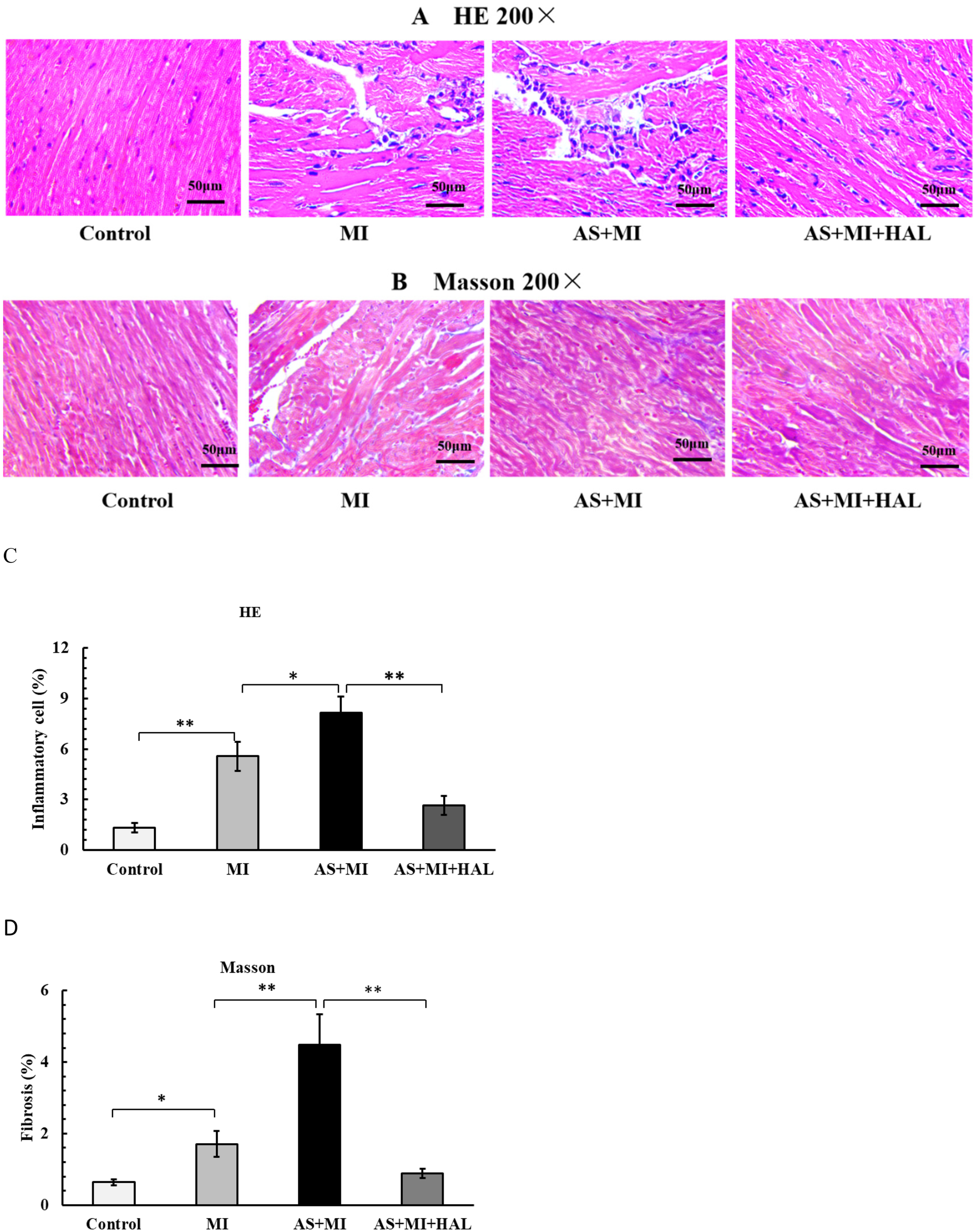 The myocardial tissue structure of mice was examined as shown in Figure 4. MI significantly increased inflammatory cell infiltration (p < 0.01) and myocardial fibrosis (p < 0.05). Furthermore, the combination of AS and MI resulted in a substantial enhancement in positive staining for H&E (Figures 4A,C) and ORO (Figures 4B,D), indicating aggravated damage to the heart muscle. In contrast, intervention with HAL significantly reduced the proportion of positive staining for both H&E and Masson trichrome compared to the AS + MI group (p < 0.01), suggesting alleviated myocardial injury.