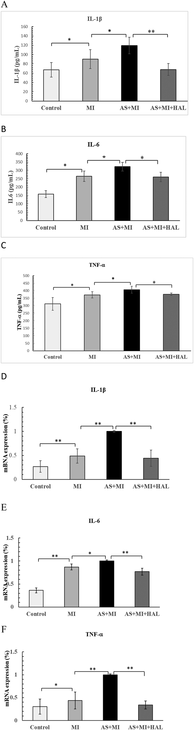 Effects of HAL on pro-inflammatory cytokines. Serum levels of IL-1β(A), IL-6 (B) and TNF-α (C) Cardiac tissue expression of IL-1β (D), IL-6 (E) and TNF-α (F) Data are mean ± SD (n = 6). *p < 0.05; **p < 0.01.