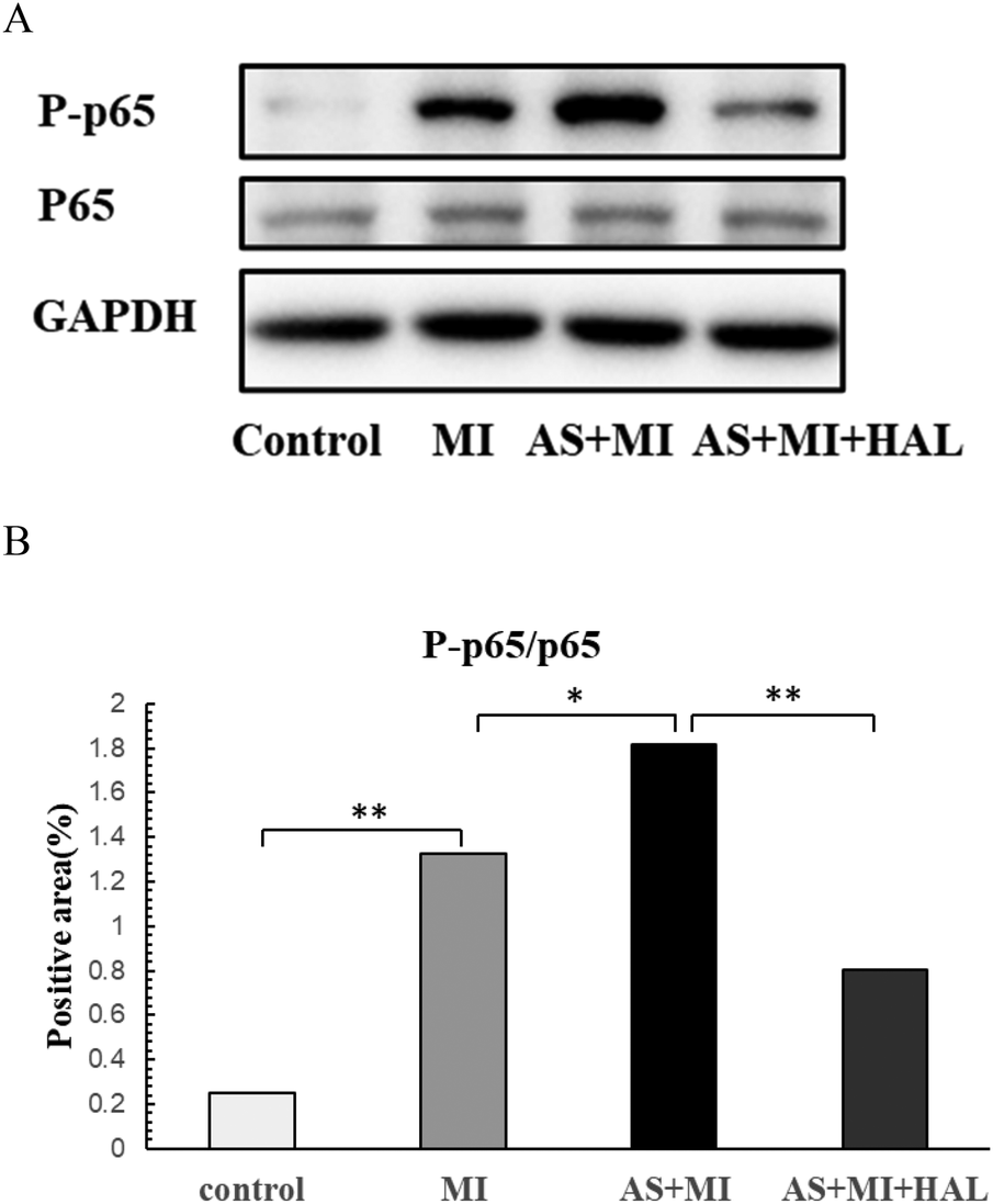 The expression levels of phosphorylated p65 (P-p65) and total p65 in cardiac infarction tissue are shown in Figure 6. Compared with the control group, the expression of P-p65 was significantly increased in the MI group (p < 0.01). Furthermore, AS exacerbated the cardiac inflammatory response compared to the MI group, as indicated by a further elevation in P-p65 expression (p < 0.05). Treatment with HAL significantly reduced the expression of P-p65 compared to the AS + MI group (p < 0.01). In contrast, the expression of total P65 remained consistent across all groups without significant changes.