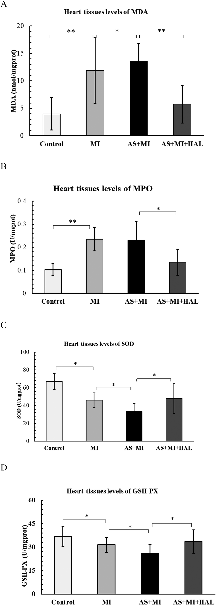 Effects of HAL on oxidative stress markers. Levels of MDA (A), MPO (B), SOD (C) and GSH-Px (D) in cardiac tissues. Data are mean ± SD (n = 6). *p < 0.05; **p < 0.01.