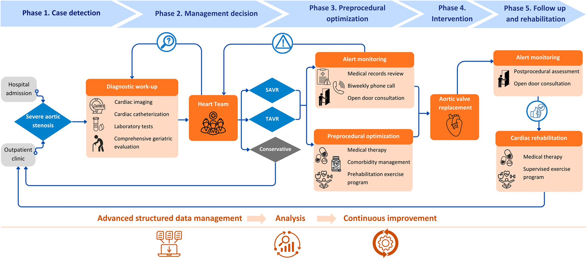 The AS-ICP standardizes all diagnostic and therapeutic interventions for patients with severe AS who are candidates for valve replacement, from diagnosis to treatment and rehabilitation (Figure 1). At our center, it is led by two specialized case-management nurses and coordinated by two cardiologists. Since its implementation in 2018, the AS-ICP has evolved as a dynamic process adapted to the changing needs and conditions of the healthcare system.