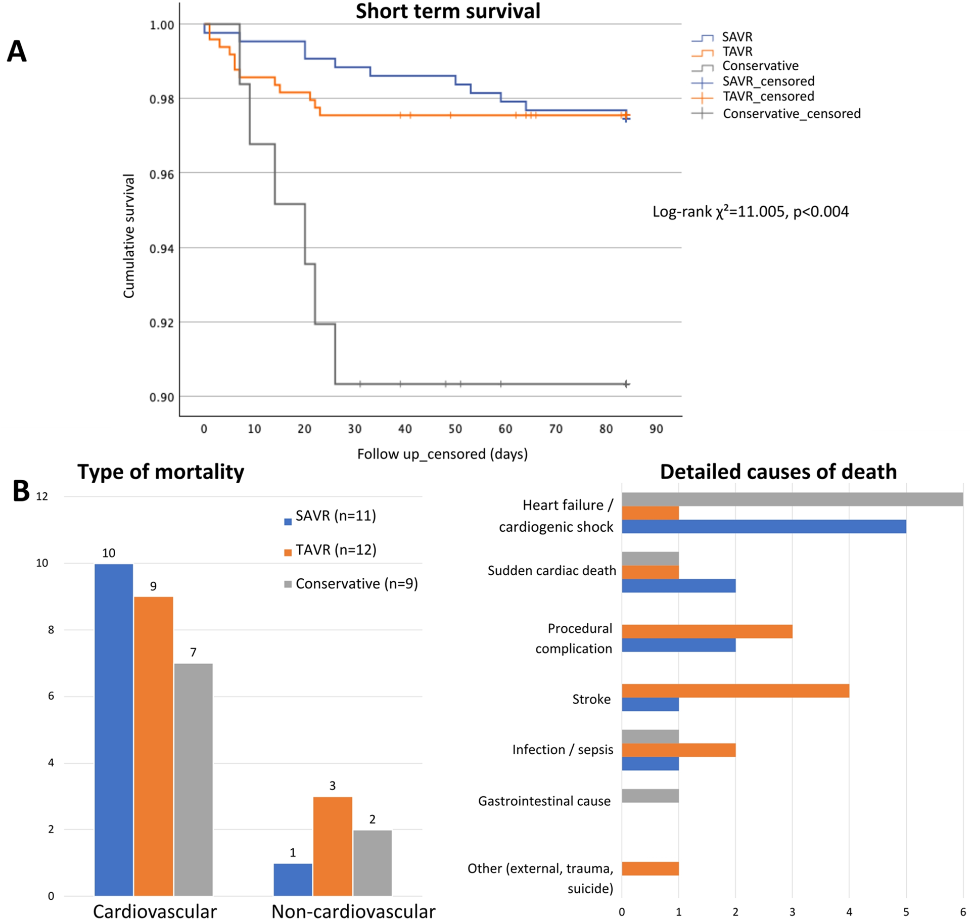 All diagnostic tests and interventions aimed at clinical optimization were recorded. Procedural outcomes for patients undergoing aortic valve replacement (SAVR or TAVR)—including success rates, complications, and mortality—were recorded following Valve Academic Research Consortium-3 (VARC-3) criteria (15) (see Supplementary Material). Periprocedural mortality was defined as all-cause death within 30 days, or later if the patient remained hospitalized after the intervention (censoring at 84 days, corresponding to maximum observed hospitalization in a deceased patient). In the conservative group, mortality was measured from the date of the last Heart Team meeting. For survival analyses, time to event was calculated from the intervention date (SAVR/TAVR) or Heart Team decision (conservative group) to death or censoring at 84 days.
