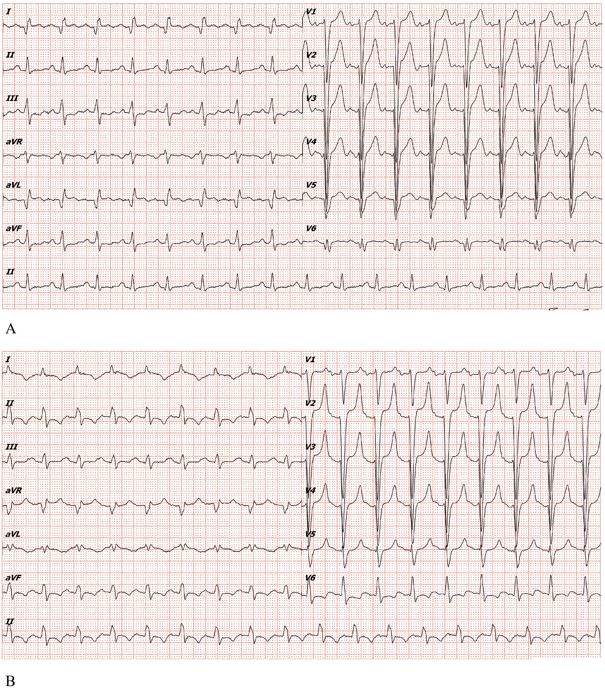 (A) Electrocardiogram of the patient in the emergency department of our hospital in 2025. (B) Electrocardiogram of the patient in 2022.