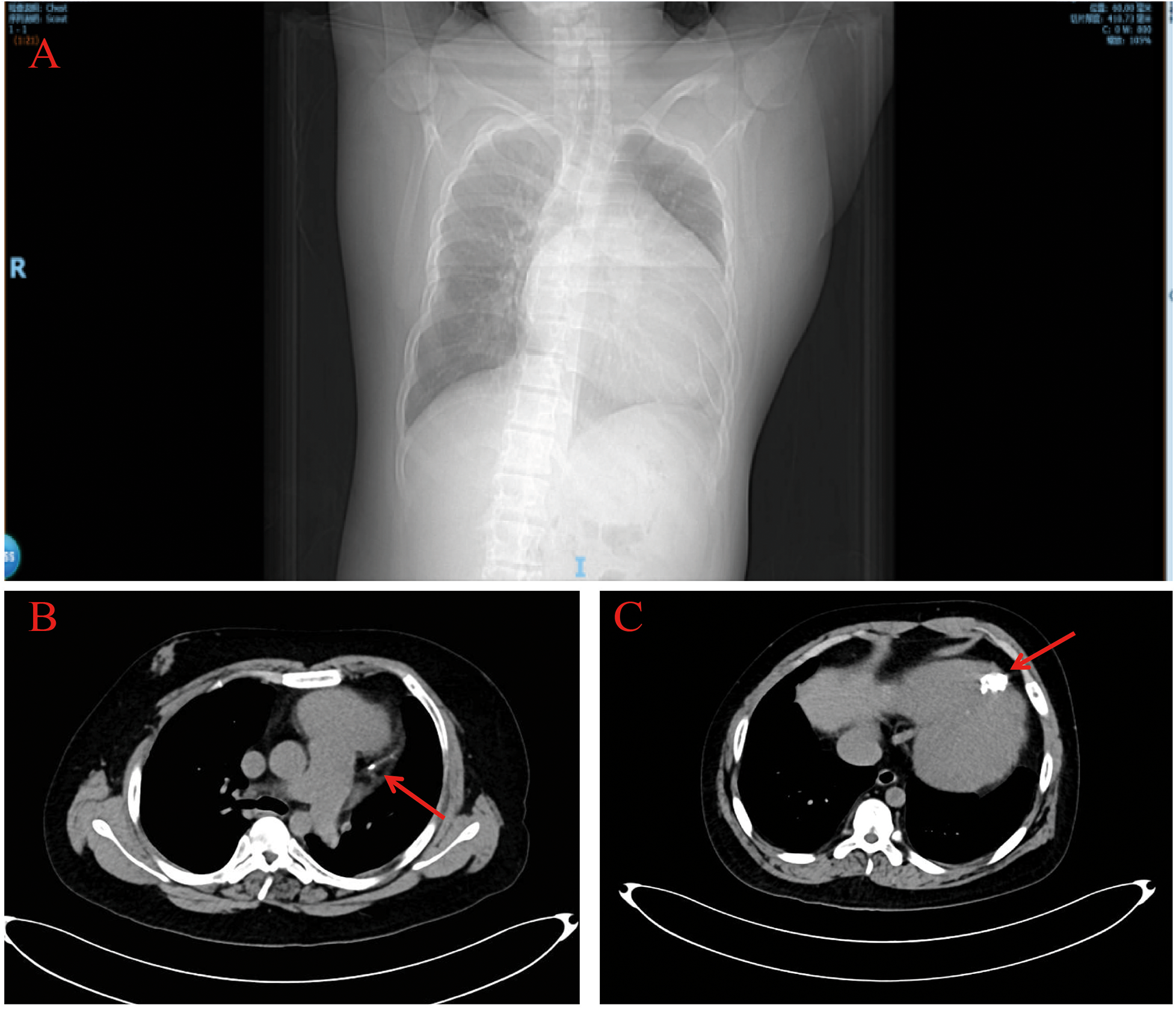 Chest contrast CT showed a markedly enlarged, globular heart (Figure 3A), linear calcification in the high lateral wall (Figure 3B, red arrow), and a hemispherical calcified lesion at the apex measuring about 3.0 × 4.0 cm (Figure 3C, red arrow).