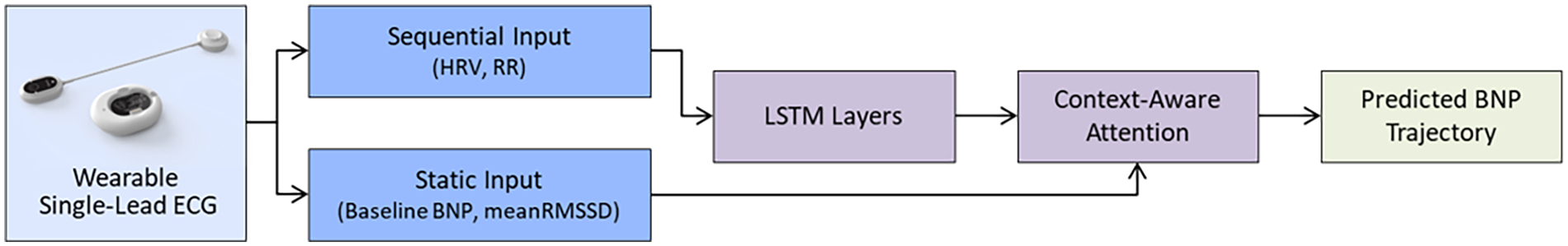 Fifty patients with persistent AF underwent 3–7 days of single-lead ECG monitoring. Heart rate variability (HRV) and RR-interval features from 30 min windows were combined with baseline clinical metrics. A context-aware deep learning model using long short-term memory (LSTM) and attention mechanisms was trained to predict 6–12-month NT-proBNP changes. Model performance was assessed using root mean squared error (RMSE), mean absolute error (MAE), and the accuracy of directional NT-proBNP change.
