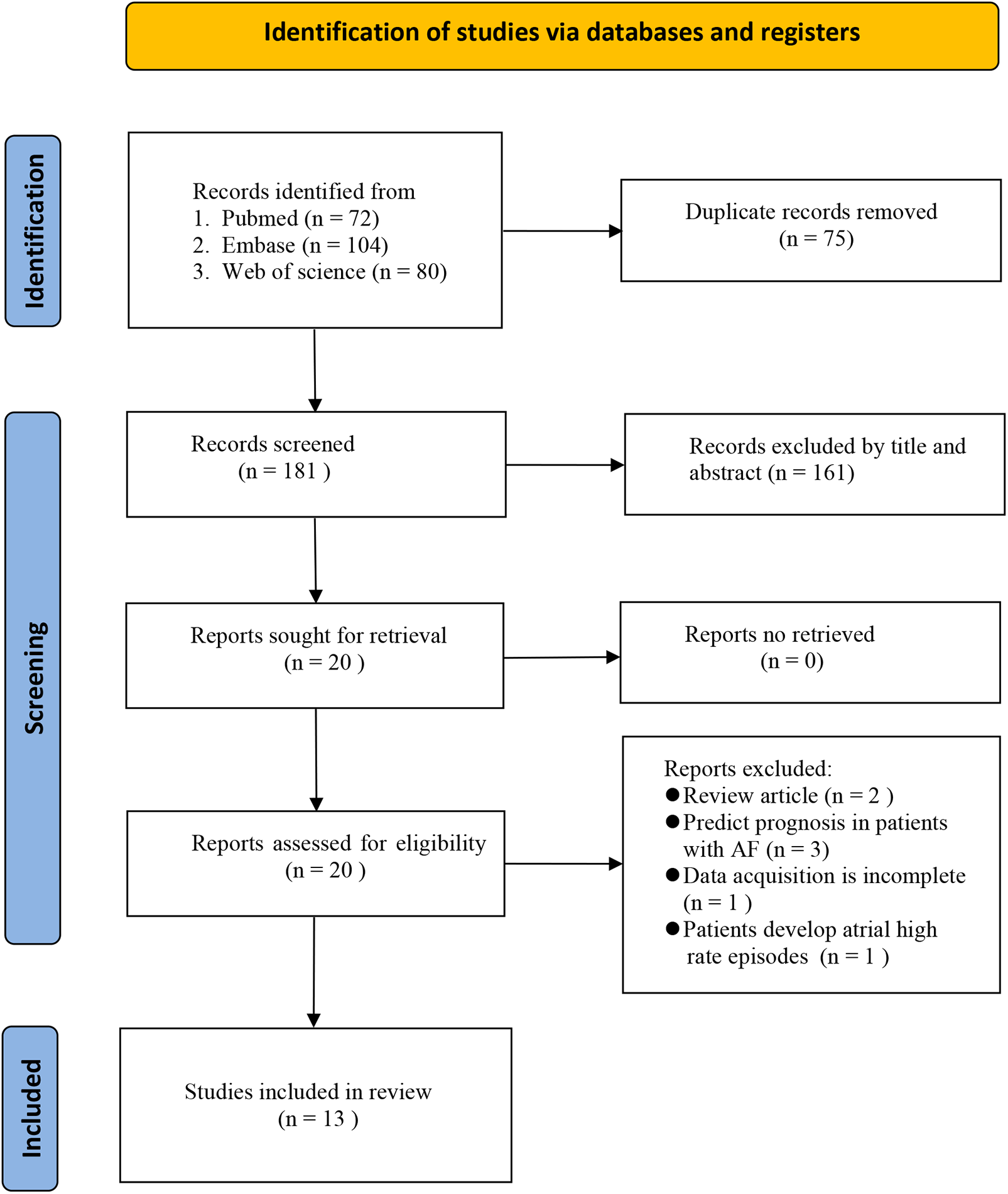 The literature screening flow diagram is shown in Figure 1. A total of 256 studies were retrieved from the three databases using the search strategy. We identified 75 duplicates and excluded them. The remaining 181 studies were screened by title and abstract to identify relevant studies. After excluding 161 studies that did not meet the inclusion criteria, 20 were eligible for comprehensive full-text review. Seven articles were excluded after full-text review for the following reasons: review articles (n = 2), prognostic prediction in patients with AF (n = 3), incomplete data acquisition (n = 1), and patients developing atrial high-rate episodes (n = 1). Finally, thirteen eligible studies involving 5,499 participants were included and analyzed (20–32).