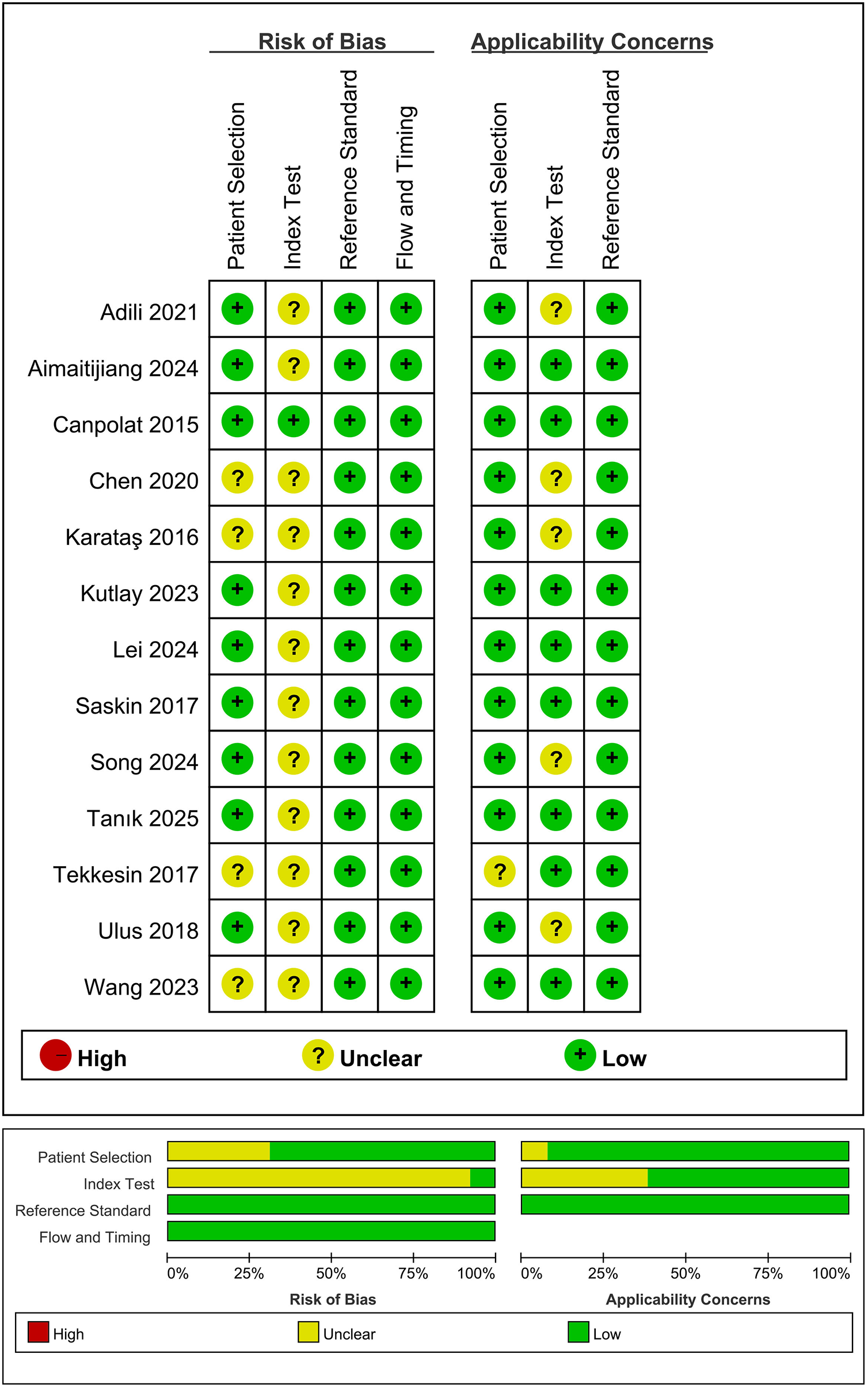 The main characteristics and findings of the included studies are presented in Table 1. Sample sizes ranged from 131 to 817, and mean patient age ranged from 53.5 to 74.4 years; the overall proportion of males was high. Follow-up periods ranged from 3 to 25.1 months. Among the included studies, one study was prospective (20), and the remaining twelve were retrospective (21–32). Seven studies were conducted in Turkey (20–24, 28, 32), and six in China (25–27, 29–31). Five studies investigated the relationship between MHR and new-onset AF after coronary artery bypass grafting (CABG) and percutaneous coronary intervention (PCI) (21–24, 32). Six studies reported an association between MHR and AF recurrence after radiofrequency maze procedure and catheter ablation (20, 25, 26, 29–31). According to the QUADAS-2 results (Figure 2), all 13 included studies were of high quality. The index test was identified as the primary source of high risk, as the diagnostic cut-off values were based on predefined thresholds. In contrast, the other domains of the studies showed a lower risk of bias.