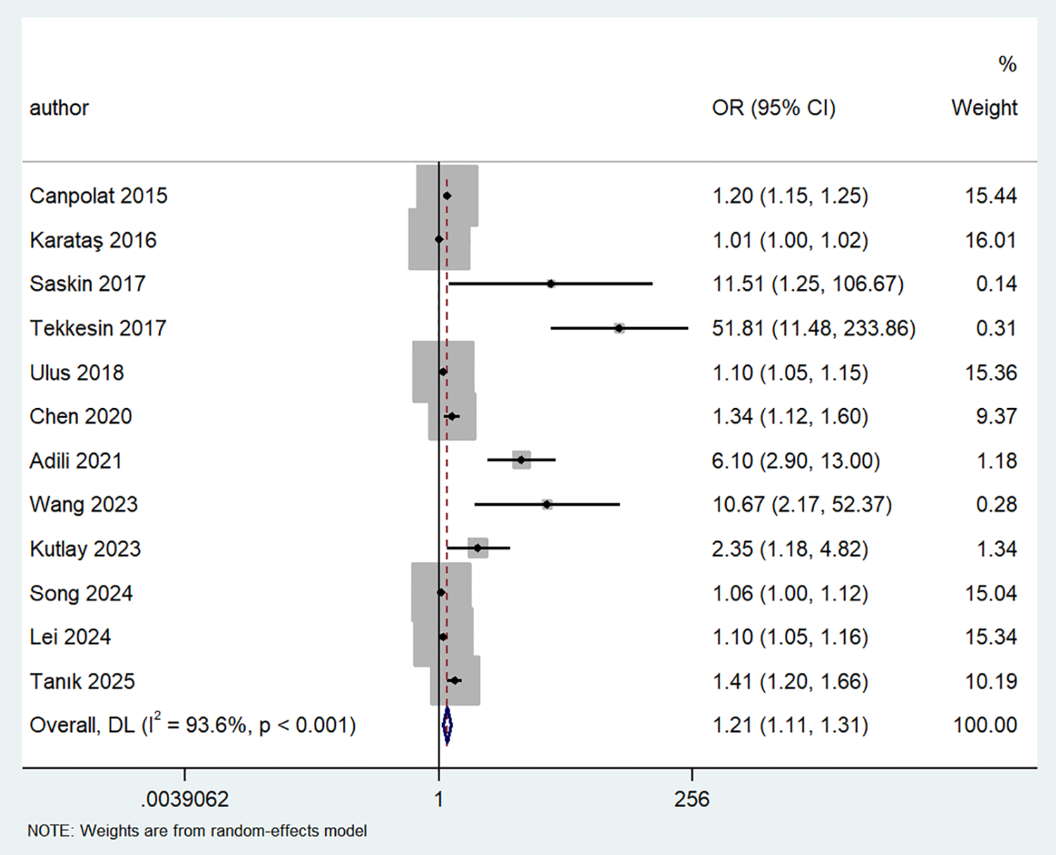 Twelve studies examined the association between MHR and AF risk, using a random-effects model (I2 = 93.6%, P < 0.001) to pool the effect size. The results showed a significant correlation between MHR and AF risk (OR = 1.21, 95% CI: 1.11–1.31, P < 0.001), indicating that MHR was an independent predictor of AF (Figure 3).