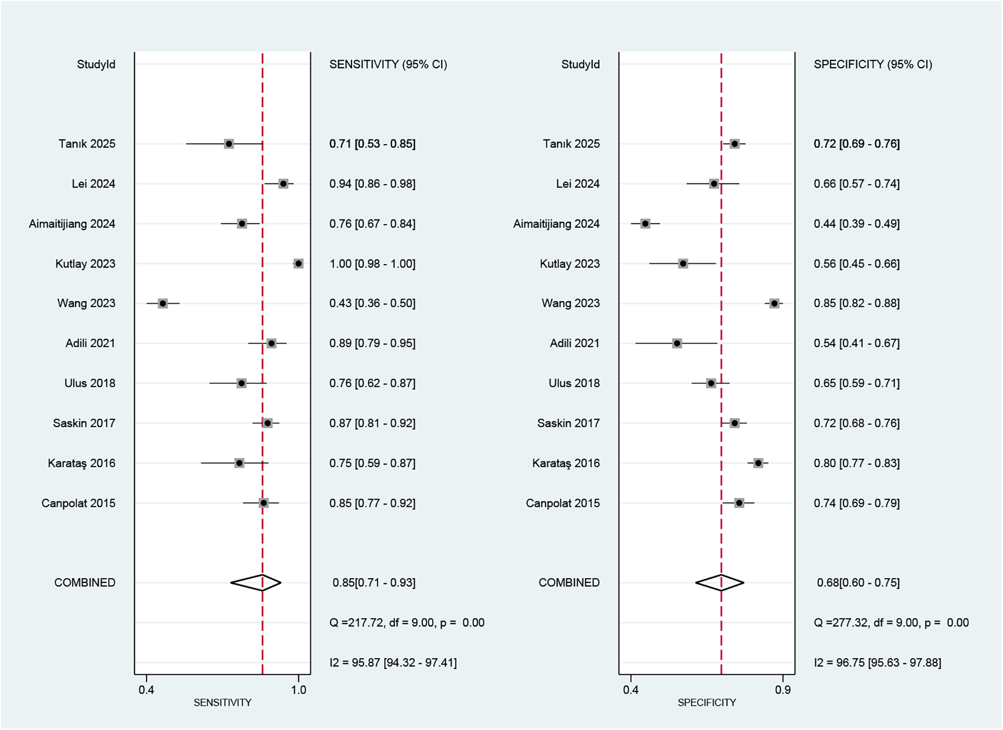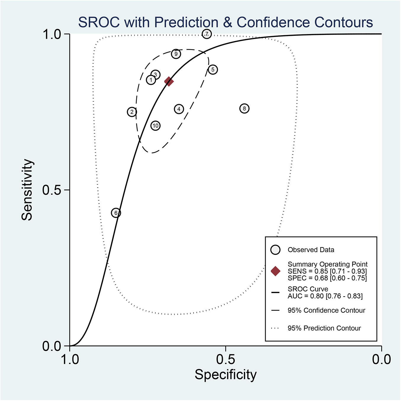 Regarding the diagnostic accuracy of MHR, the pooled sensitivity was 0.85 (95% CI: 0.71–0.93), and the specificity was 0.68 (95% CI: 0.60–0.75). Significant heterogeneity was observed across studies. The I2values were 95.87% (95% CI: 94.32–97.41) for sensitivity and 96.75% (95% CI: 95.63–97.88) for specificity (Figure 4). As shown in Supplementary Figure S1, the +LR and −LR were reported as 2.67 (95% CI: 2.16–3.30) and 0.22 (95% CI: 0.12–0.42), respectively. The diagnostic score and DOR presented in (Supplementary Figure S2) were 2.48 (95% CI: 1.78–3.18) and 11.94 (95% CI: 5.90–24.17), respectively. The SROC curve in Figure 5 showed an AUC of 0.80 (95% CI: 0.76–0.83), suggesting moderate diagnostic accuracy.