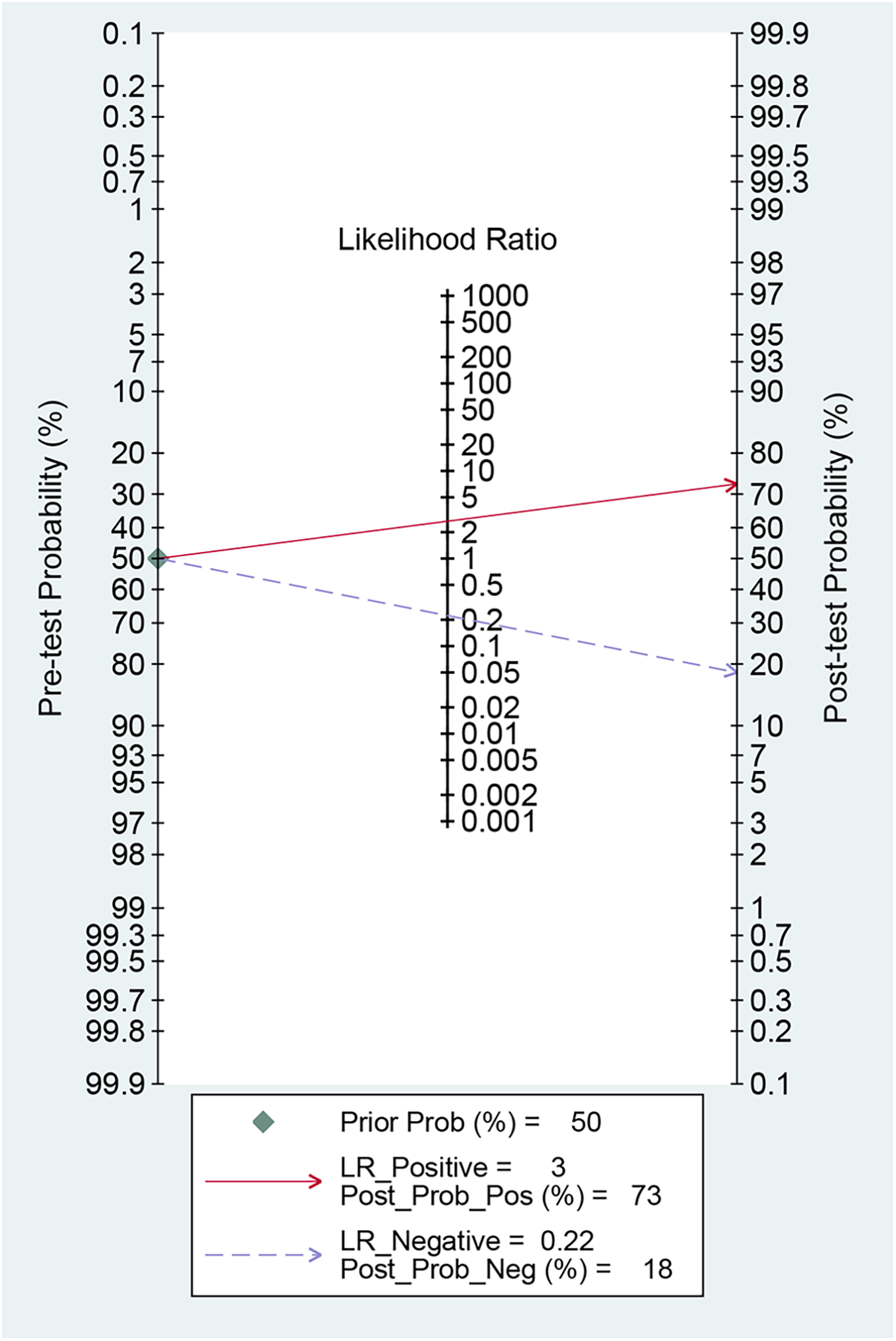 Linear regression analysis was used to assess funnel plot asymmetry. The Deeks' funnel plot was symmetrical, indicating no evidence of publication bias (P = 0.45) (Figure 9).