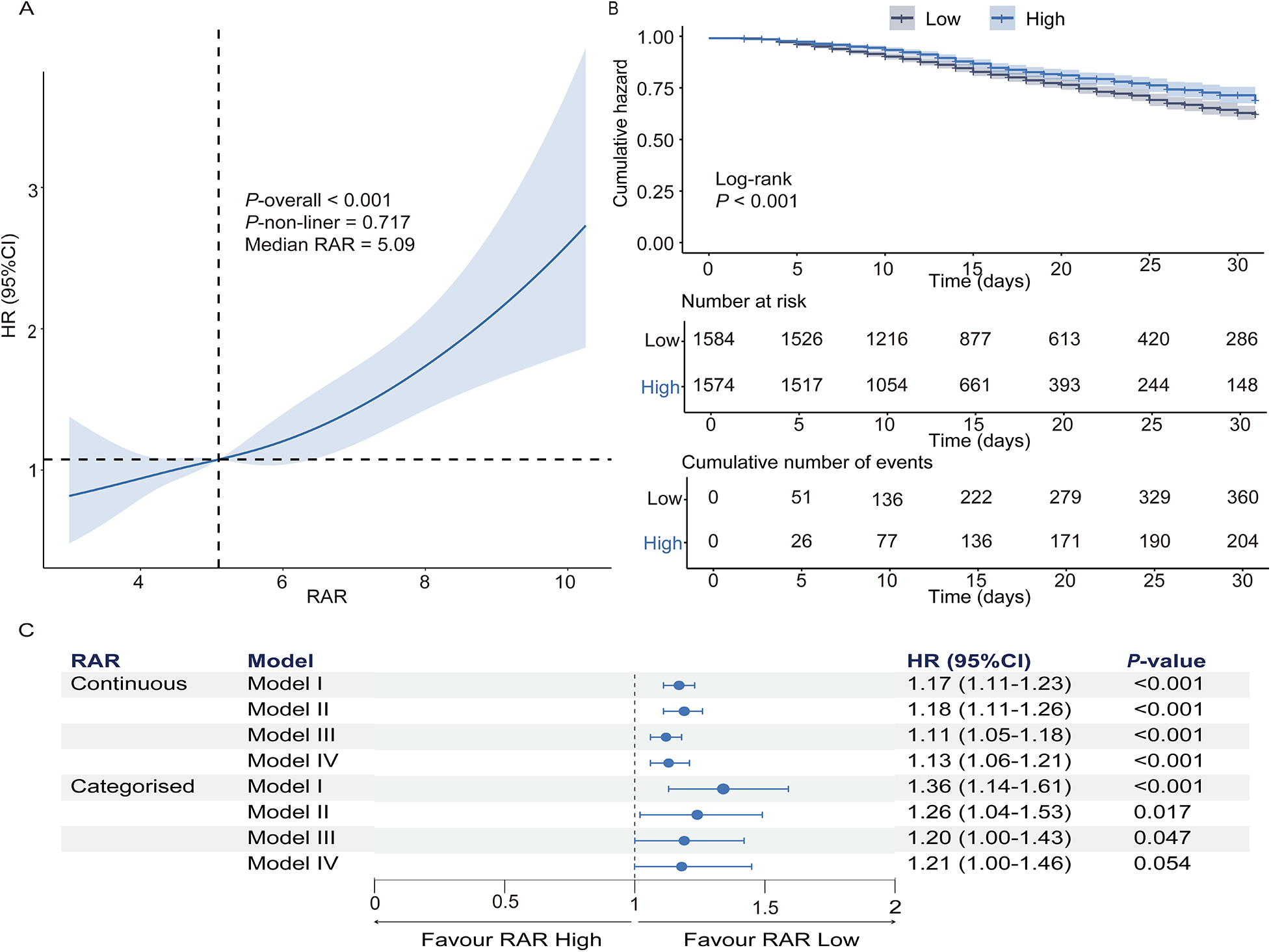 Multivariable Cox regression revealed that elevated RAR independently predicted in-hospital mortality after full adjustment (demographics, vital signs, laboratory parameters, comorbidities). As a continuous variable, each unit elevation in RAR conferred a 13% higher mortality risk [HR: 1.13 (95% CI: 1.06–1.21); P < 0.001]. When RAR was analyzed as a categorical variable, the high RAR group demonstrated a 1.28-fold mortality hazard relative to the low RAR group [HR: 1.21 (95% CI: 1.00–1.46); P = 0.054] (Figure 2C).