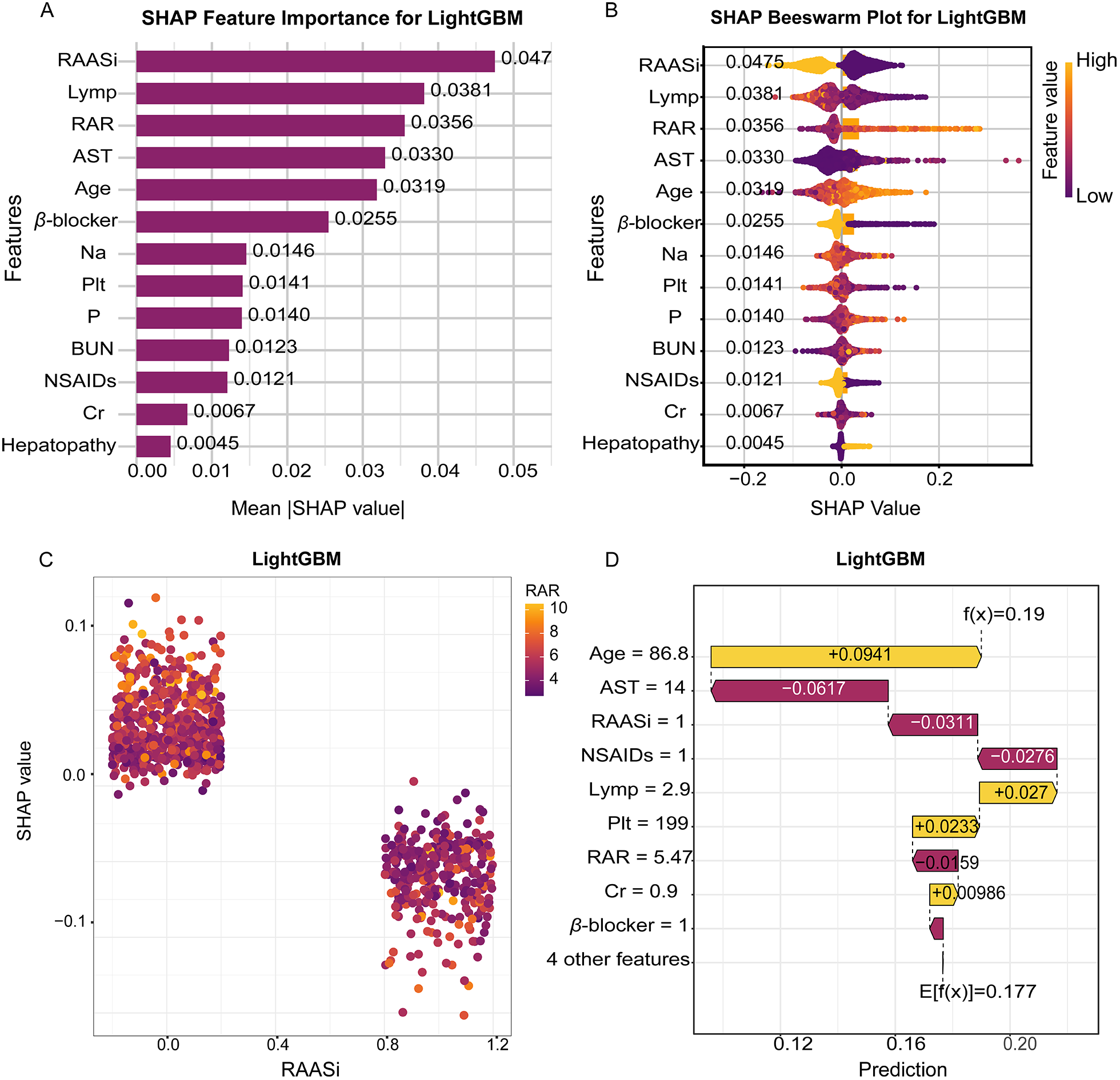 The application of machine learning in our study, particularly the LightGBM model, enhanced the predictive accuracy for in-hospital mortality. The model demonstrated stable discrimination across both internal and external validation cohorts, underscoring the robustness and generalizability of our findings. SHAP analysis provided invaluable interpretability, allowing us to visualize the contribution of each feature to mortality risk at both the population and individual levels. By calculating the SHAP values, we can break down the contribution of individual features (21), such as RAR, renal function indices, and the use of RAASi or beta blockers. At the population level, SHAP revealed that RAR, along with RAASi use, lymphocyte percentage is one of the most influential factors in predicting mortality risk. These findings are clinically meaningful, as they underscore how inflammatory and nutritional status—reflected by RAR—play pivotal roles in the prognosis of HF patients with pneumonia. On the individual level, SHAP provided detailed insights into how specific features influence the mortality risk of individual patients. For instance, in certain patients, higher RAR was associated with a substantially increased risk of mortality, while the presence of RAASi or beta blockers provided a protective effect, shifting the risk toward a lower prediction. This level of interpretability not only improves transparency but also empowers clinicians to make more informed decisions based on individualized patient data, moving beyond a one-size-fits-all model. These insights complement traditional regression models by identifying nonlinear relationships and interactions that may otherwise be overlooked. For instance, while linear models suggest the direct contribution of individual predictors, SHAP uncovers complex interactions—such as between inflammatory markers and treatment regimens—that influence patient outcomes in a more nuanced manner. This enhanced understanding of the model's decision-making process is consistent with the growing body of literature that integrates SHAP into clinical applications (22, 23).