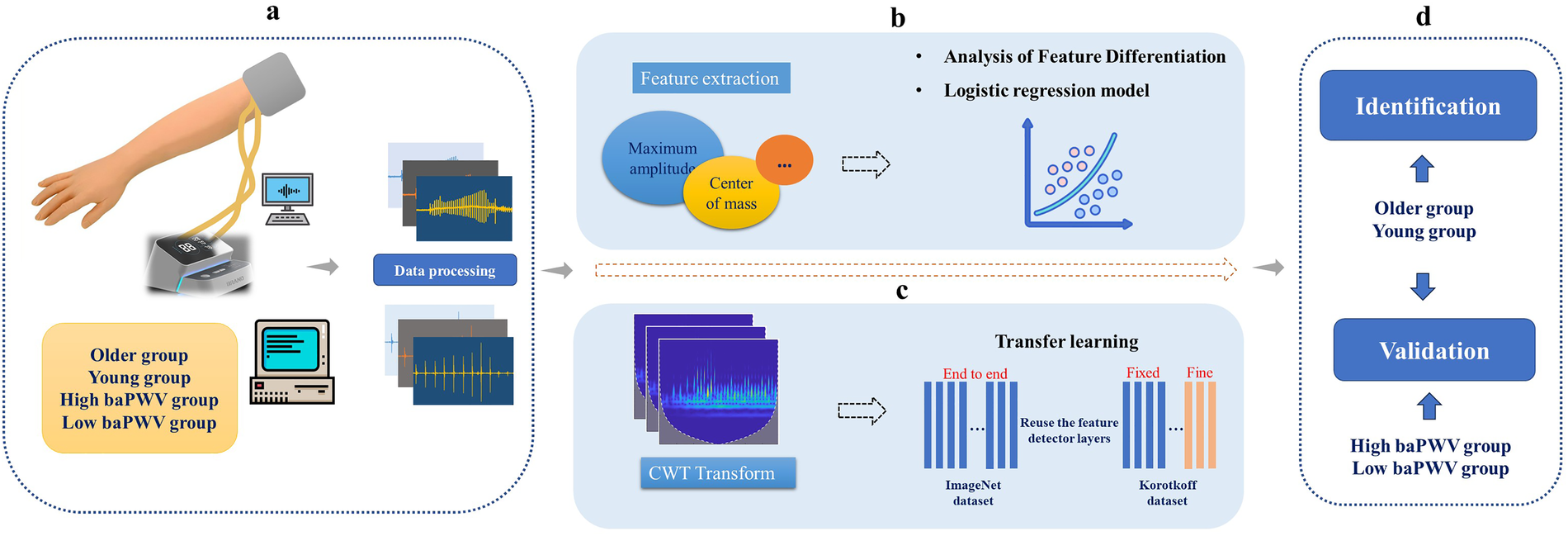 Schematic diagram of the study methodology. baPWV, brachial-ankle pulse wave velocity. CWT, continuous wavelet transforms. (a) Data Acquisition and Preprocessing: Korotkoff sound signals were collected and preprocessed. Participants were stratified into older group vs. young group (age-stratified), and into high-baPWV group vs. low-baPWV group. (b) Traditional Feature Analysis: Time- and frequency-domain features were extracted from the signals and compared between the older group and young group to identify significant differences. A logistic regression model was subsequently developed for classification. (c) Deep Learning-Based Classification: Time-frequency images were generated via CWT, and convolutional neural networks were trained using a transfer learning approach. (d) Clinical Feasibility: The Korotkoff sound–based approach was further evaluated against measured baPWV data.