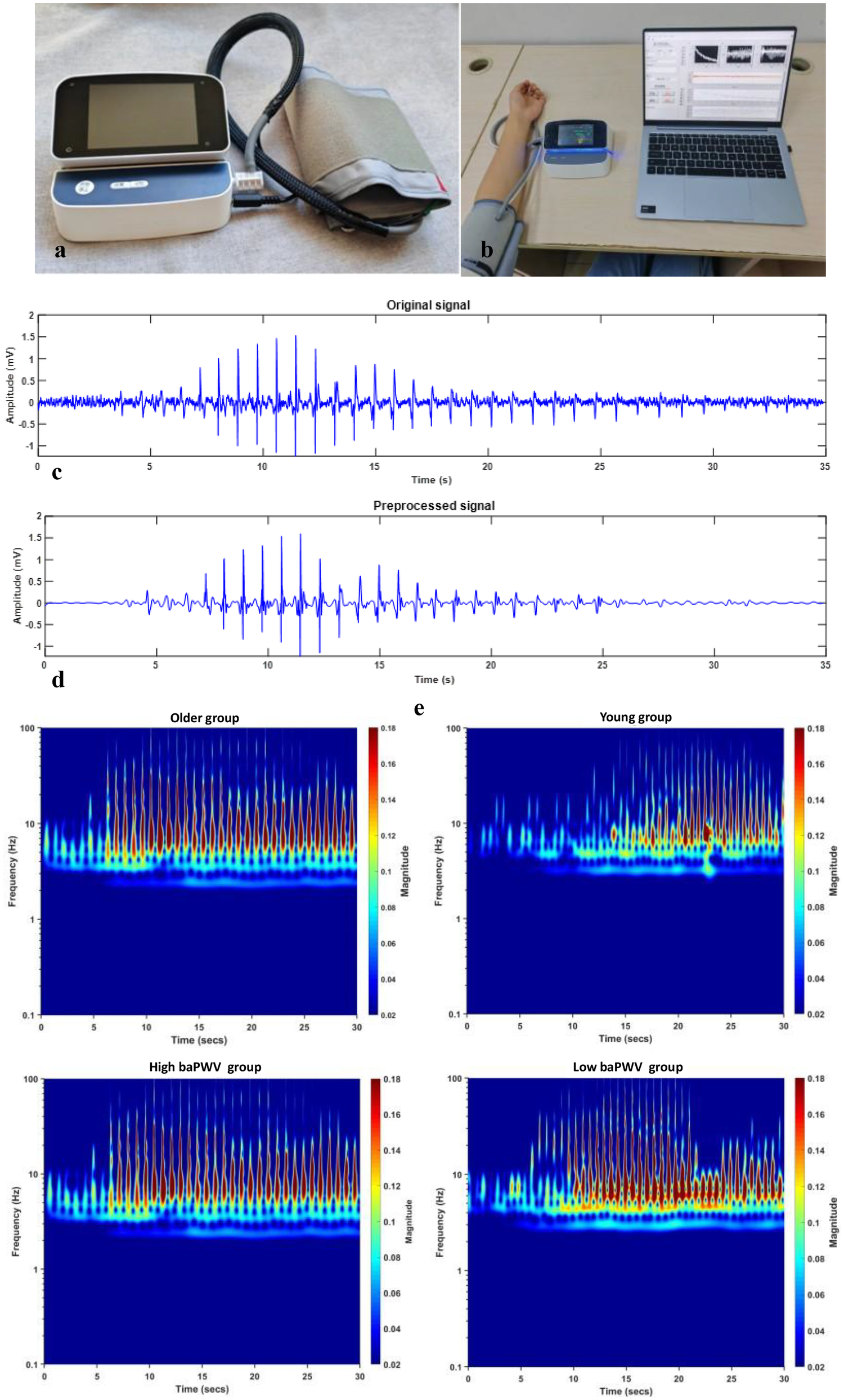 baPWV, brachial-ankle pulse wave velocity. (a) The self-developed Korotkoff sound signal acquisition device. (b) The process of collecting signals. (c) The original Korotkoff sound signal. (d) The preprocessed Korotkoff sound signal. (e) The time-frequency RGB images after continuous wavelet transform (older group vs. young group, high-baPWV group vs. low-baPWV group).