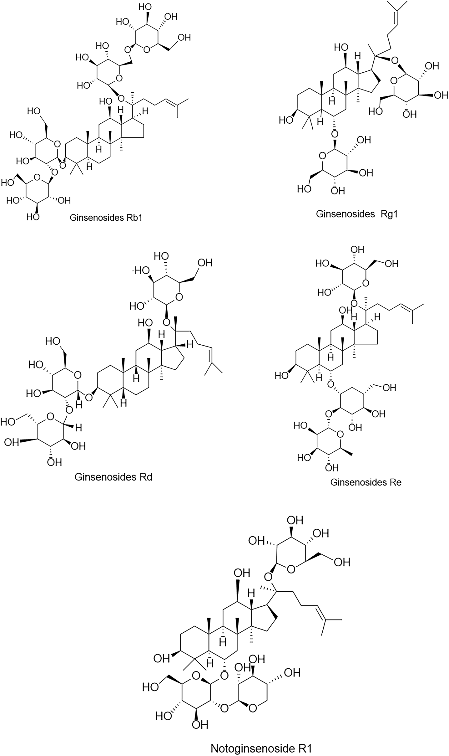 Panax notoginseng containing about 200 compounds, including saponins, flavonoids, cyclic peptides, sterols, and amino acids, etc., of which PNS is the major activity component of panax notoginseng (19). PNS are predominantly dammarane triterpenes with 20 (S)-protobirdiol or 20 (S)-protobirditriol aglycon moieties and contain about 30 kinds of saponins, among them, ginsenosides Rb1 (Rb1), ginsenosides Rg1 (Rg1), ginsenosides Rd (Rd), ginsenosides Re (Re) and notoginsenoside R1 (NGR1) were the most abundant (20), and their chemical structures (Figure 1). Drugs with PNS as the main ingredient include xueshuantong injection, xuesaitong injection, etc., which are widely used in treating acute myocardial infarction, angina pectoris, and cerebral infarction (21–25).
