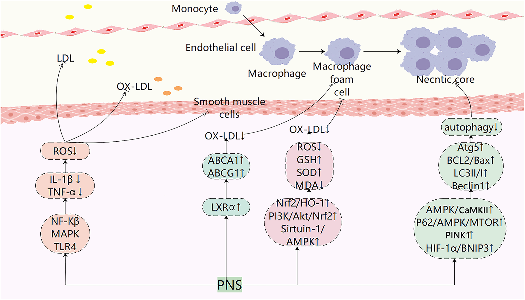 Lipid macrophages, often referred to as foam cells, are the central component of plaques and are characteristic of atherosclerotic plaques (63). Foam cells are formed from the uptake of lipids oxidised by activated monocytes/macrophages. In this process, modified lipoproteins enter the cell via a receptor and excess neutral lipids are stored as lipid droplets (64). ATP-binding cassette transporter A1 (ABCA1) reduces excess lipids in the cell, thereby preventing foam cell formation (65). PNS can reduce cholesterol ester by upregulating ABCA1 expression and lowering cholesterol ester levels, thereby inhibiting foam cell formation (66). ABCA1 and ATP-binding cassette transporter G1 (ABCG1) mediate cellular cholesterol efflux in the presence of receptors (e.g., HDL), and the liver X receptor alpha (LXRα) can directly regulate ABCA1 and ABCG1 expression (67). PNS was found to increase transcriptional activation of the LXRα gene promoter and subsequently upregulate ABCA1 and ABCG1 (36). Hypoxia-inducible factor-1α (HIF-1α) participates in atherosclerosis development by regulating glycolysis and macrophage polarization. Studies indicate that in mouse atherosclerosis models, PNS effectively suppresses abnormal glycolysis induced by HIF-1α overexpression, thereby inhibiting M1 macrophage polarization while promoting M2 macrophage polarization and modulating sphingolipid metabolism (68).
