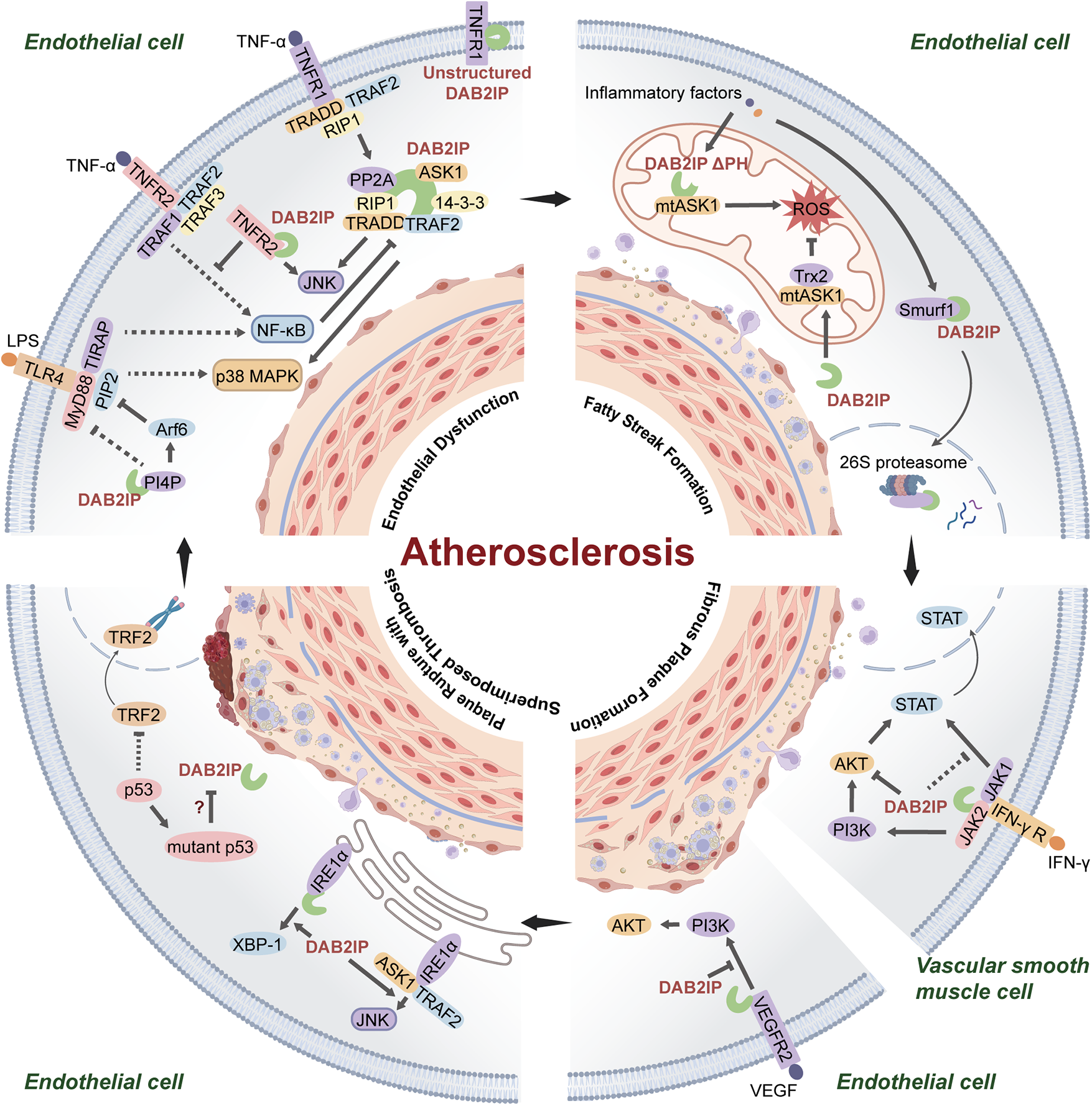 DAB2IP-mediated signaling pathways in atherosclerotic progression. (1) DAB2IP inhibits TNF-α-mediated inflammatory pathway formation and TLR4-TIRAP-MyD88 complex assembly, resulting in endothelial dysfunction; (2) Fatty streak phase inflammatory stress triggers normal DAB2IP degradation and activation of aberrant mitochondrial DAB2IP (lacking PH domain), promoting ROS production; (3) DAB2IP inhibits IFN-γ-induced PI3K/AKT and JAK2/STAT1/3 signaling in VSMCs and blocks VEGFR2/PI3K p85 complex formation in ECs during fibrous plaque stage, suppressing excessive apoptosis; (4) DAB2IP drives IRE1α/XBP1 ER stress and IRE1-TRAF2/JNK activation in unstable plaques; role of p53 senescence in DAB2IP regulation undetermined.