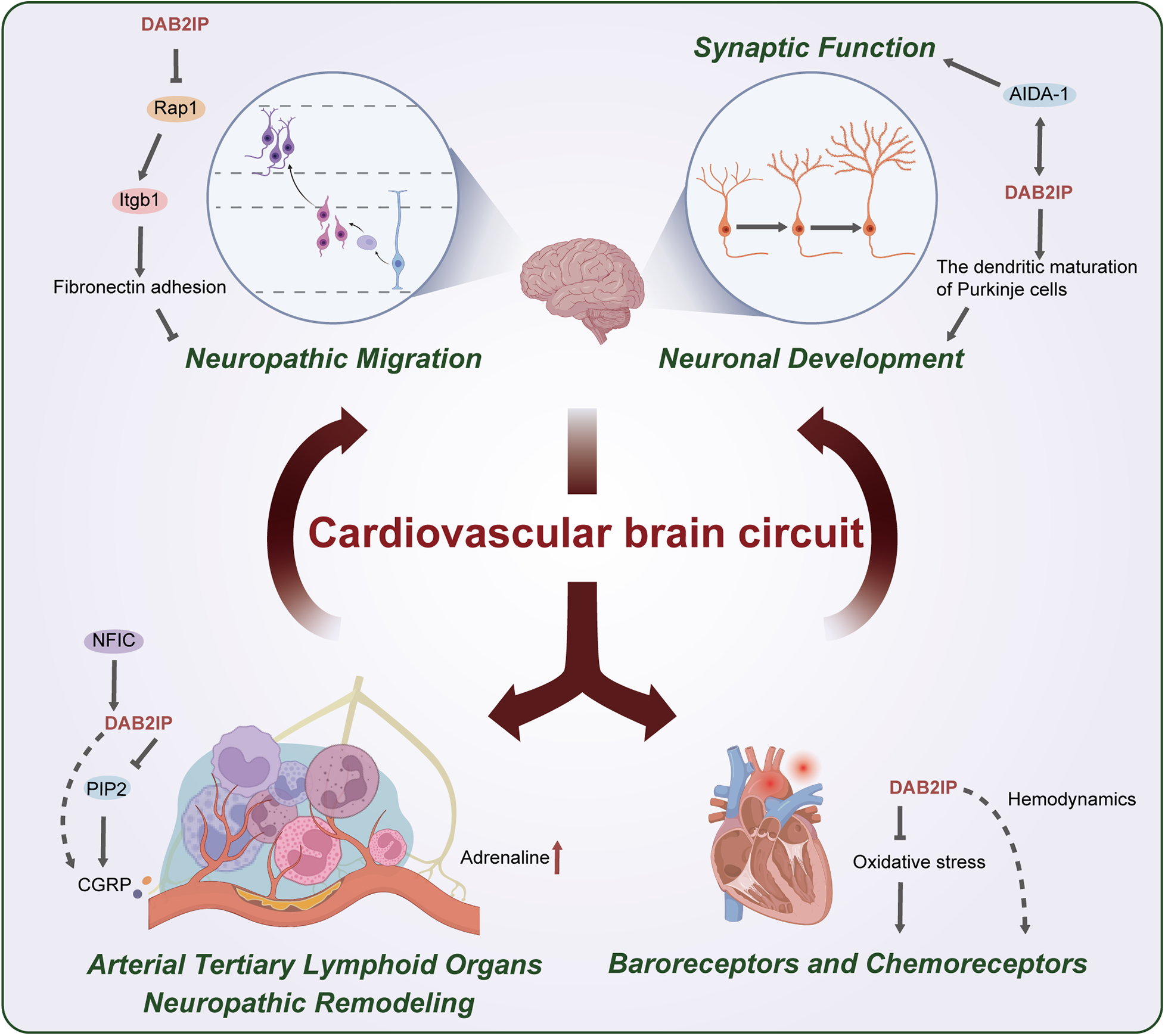Roles of DAB2IP in the cardiovascular brain circuit. (1) Tertiary lymphoid organs form around atherosclerotic plaques, a process in which DAB2IP-mediated immune cell recruitment may be involved; (2) Upregulation of DAB2IP expression by NFIC may modulate the release of CGRP; (3) Impaired PIP2-mediated calcium release resulting from DAB2IP deficiency may lead to aberrant CGRP release; (4) The positive correlation between DAB2IP and plasma epinephrine levels may partially reflect sympathetic nerve remodeling at vascular lesion sites, which contributes to increased epinephrine; (5) DAB2IP suppress oxidative stress, which could stimulate chemoreceptors. The association of DAB2IP with blood pressure and heart rate suggests its potential role in modulating baroreceptor activity; (6) Loss of DAB2IP upregulates Rap1 activity, stimulating integrin β1-mediated fibronectin adhesion and thereby inhibiting neuronal migration; (7) DAB2IP promotes dendritic maturation in cerebellar Purkinje cells; (8) The high binding affinity between DAB2IP and AIDA-1 indicates its potential role in regulating synaptic function.