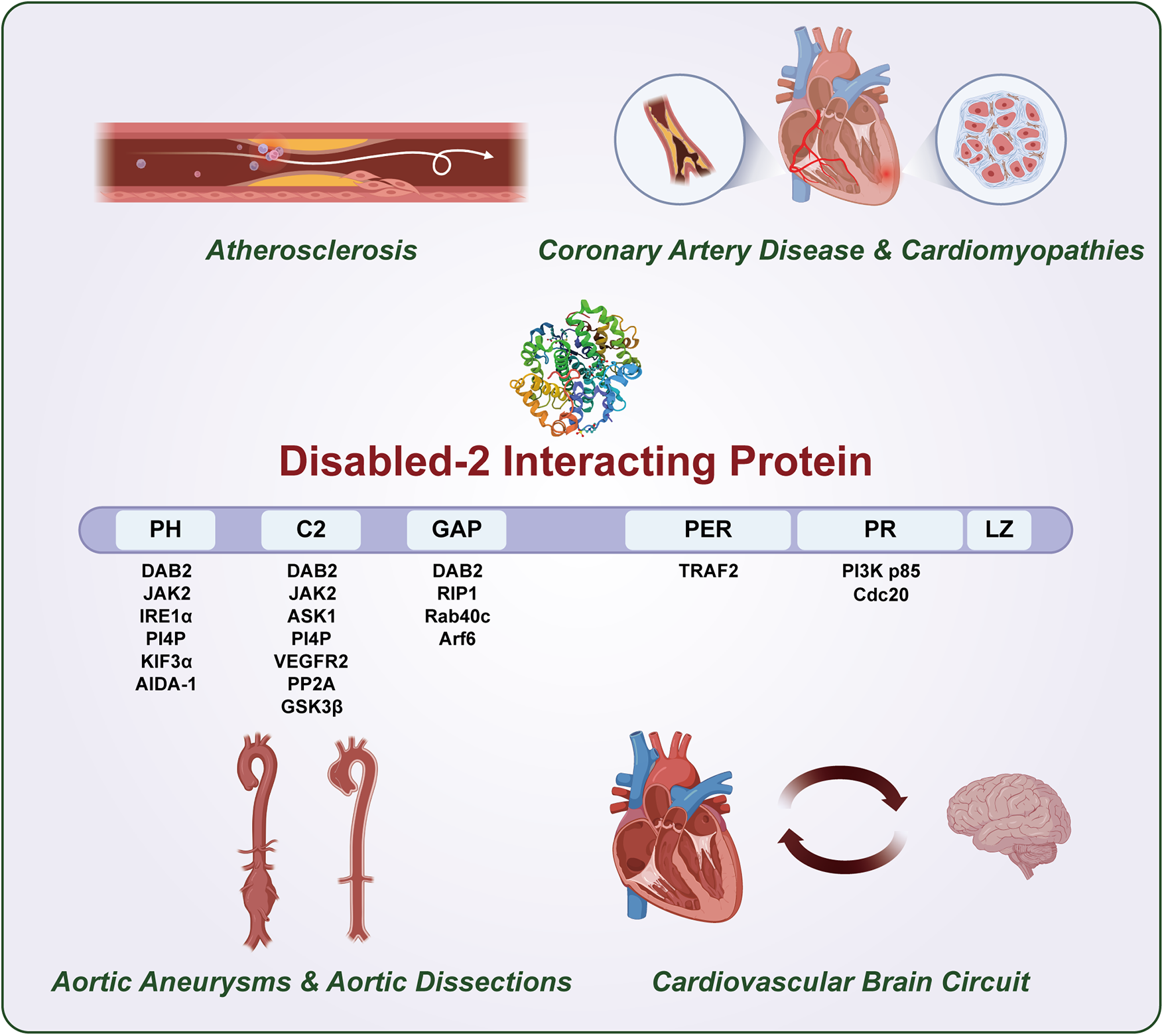 Although researchers have extensively characterized DAB2IP in oncology, its functional significance in cardiovascular and neurological systems remains poorly investigated. In this review, we comprehensively described the key regulatory mechanisms of DAB2IP as a multifunctional signaling hub in various cardiovascular pathologies, including AS, CAD, AA, and AD (10–13). We also assessed the plausible roles of DAB2IP in CBC as an informed speculation, based on its established molecular functions and signaling mechanisms in various physiological contexts (1). Additionally, we critically evaluated its potential as a pleiotropic modulator for therapeutic interventions targeting both CVDs and cardio-cerebral comorbidities (Central Illustration).