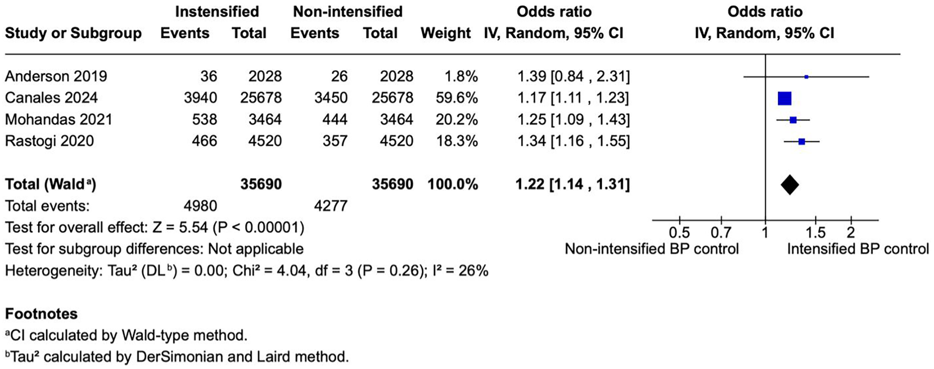![Forest plot showing four studies comparing intensified versus non-intensified blood pressure control. Each study displays odds ratios and confidence intervals, with a total odds ratio of 1.22 [1.14, 1.31]. Data include events, totals, and weights, with a significant overall effect (Z = 5.54, P < 0.00001). Heterogeneity is low with I² = 26%.](https://www.frontiersin.org/files/Articles/1691926/xml-images/fcvm-13-1691926-g003.webp)