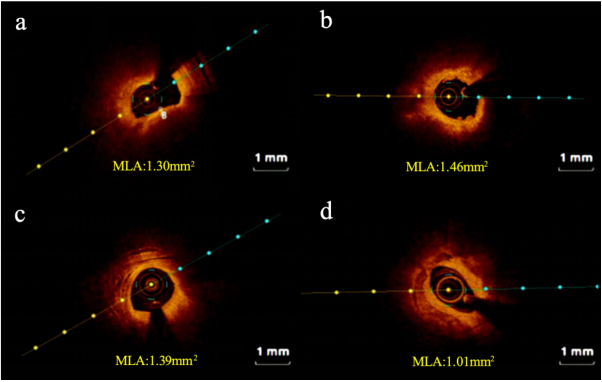 Representative cross-sectional optical coherence tomography images. (a) High-risk plaque in STEMI patient; (b) high-risk plaque in NSTEMI patient; (c) non-high-risk plaque in STEMI patient; (d) non-high-risk plaque in NSTEMI patient. STEMI, ST-segment elevation myocardial infarction; NSTEMI, Non-ST-segment elevation myocardial infarction; MLA: minimum lumen area.