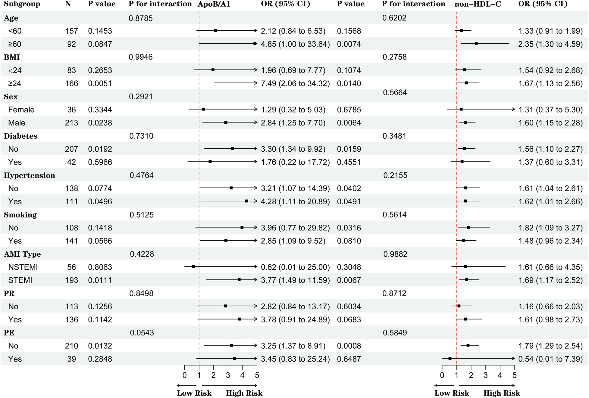Among 249 AMI patients, 137 (55.0%) exhibited OCT-characterized high-risk plaques. These patients were more often male (89.8%) and presented with STEMI (84.7%). They had elevated levels of myoglobin, LDL-C, non-HDL-C, ApoB, ApoB/A1, remnant lipoprotein cholesterol (RLP-C), non-HDL-C/HDL-C ratio (NHHR), and TC/HDL-C (all P < 0.05). OCT features included thinner fibrous caps, smaller lumen areas, larger lipid arcs, and higher incidences of rupture, erosion, thrombus, macrophage infiltration, cholesterol crystals, and calcification (all P < 0.05). Both ApoB/A1 (OR = 3.688, 95% CI: 1.211–11.230) and non-HDL-C (OR = 3.023, 95% CI: 1.238–7.378) were independently and linearly associated with high-risk plaques. No significant interactions were observed across clinical subgroups (all P for interaction > 0.05). The combined model incorporating the two markers achieved the highest discriminative performance (AUC = 0.696) and significantly improved the baseline model (DeLong test P < 0.05), with additional gains confirmed by IDI, NRI, and DCA (all P < 0.05).