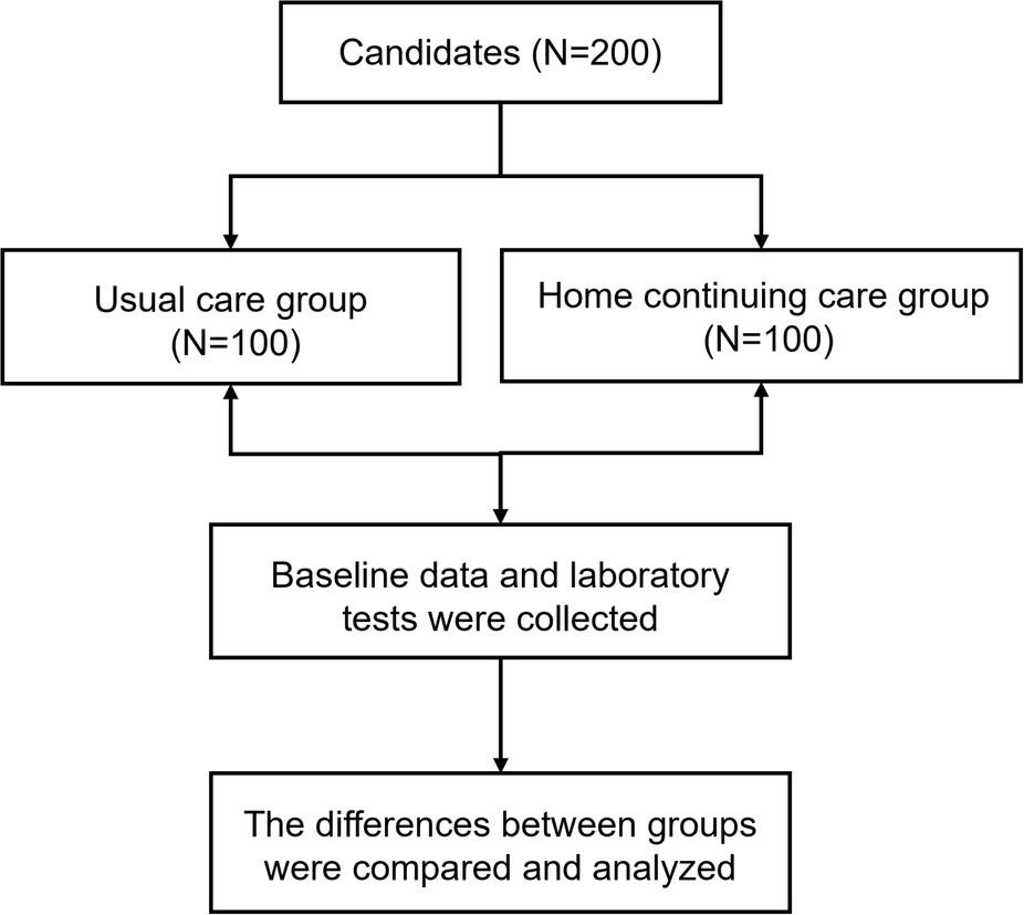 Continuous home care group: All patients in this group received continuous home care services, as follows. (1) Formation of a service team: All cardiology nurses formed a service team, called “Continuous Service Group.” Every 2–3 nursing staff formed a team freely, and there were four teams in total. The head nurse was the team leader and assigned tasks. The four teams were responsible for network services, telephone services, community services, and home services, respectively. (a) Network services: Services were provided to patients through online platforms such as WeChat, QQ, and email, including educating the patients and their families about myocardial infarction, the importance of understanding the condition, and preventing recurrence. The patients were trained on how to self-monitor vital signs and recognize warning signals. (b) Telephone services: Telephone services were provided to the patients every Friday morning, and the patients and their families were contacted to ascertain the patients’ recovery status, inquire about any discomfort experienced by them, and provide appropriate guidance. The patients were reminded to seek follow-up care if any abnormalities were detected. (c) Community services: After discharge, the patients registered at their community hospital, where healthcare providers fully understood their hospital treatment and medication history. A comprehensive community rehabilitation and home care plan for the patients was established, including the creation of a community medical record. This record documented the patients’ medication treatment, daily living habits, diet, exercise, and physical conditions. Regular first aid training was provided, teaching family members how to respond to acute myocardial infarction suffered by the patients, including their level of familiarity with cardiopulmonary resuscitation (CPR) and the use of automatic external defibrillator (AED). (d) Home service: Monthly home visits were conducted by nurses to assess health behavior compliance, physical recovery, and emotional state. If severe negative emotions were identified, they were addressed promptly. Nurses monitored changes in the patients’ condition and documented these for physician reference. In addition, the nursing team ensured active communication among the team members, regularly updating the patients’ health status and care plan.