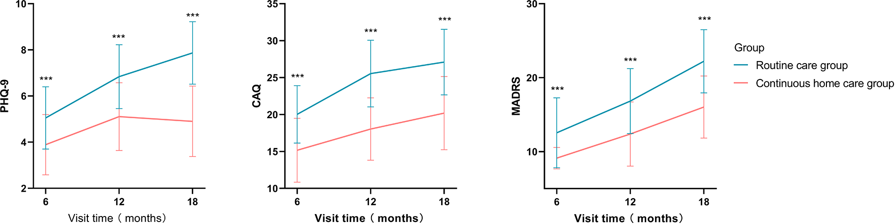 As shown in Figure 2, the study collected anxiety and depression indicators PHQ-9, CAQ, and MADRS scores of the two groups of patients at 6, 12, and 18 months. The results found that at 6 months’ follow-up, the PHQ-9 score was 5.05 ± 1.35 in the routine care group and 3.89 ± 1.3 in the continuous home healthcare group (P < 0.001); at 12 months’ follow-up, the PHQ-9 score was 63.82 ± 6.73 in the routine care group and 74.42 ± 7.24 in the continuous home healthcare group (P < 0.001); at 18 months’ follow-up, the PHQ-9 score was 54.15 ± 13.30 in the routine care group and 63.94 ± 11.28 in the continuous home healthcare group (P < 0.001).