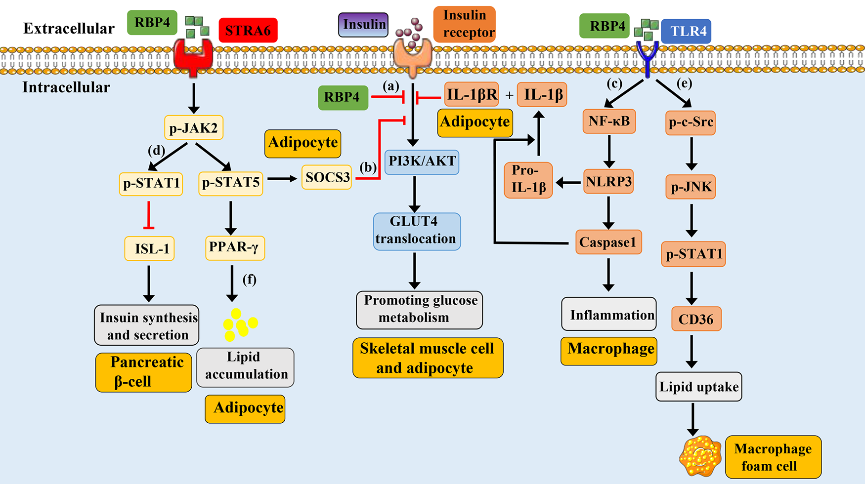 Schematic representation of RBP4-mediated signaling pathways. Under physiological conditions, the binding of insulin-to-insulin receptors promotes the activation of PI3K/AKT, leading to the translocation of GLUT4 and promoting glucose metabolism. (a): Overexpression of mouse RBP4 or injection of purified human RBP4 recombinant protein into mice can inhibit insulin induced activation of PI3K/AKT. (b): Circulating RBP4 can recruit and activate JAK2 by binding to the adipocyte surface receptor STRA6, thereby promoting phosphorylation of STAT5. Subsequently, phosphorylated STAT5 enters the nucleus, causing the expression of target genes SOCS3 and PPAR-γ, which respectively inhibit the insulin signaling pathway and promote lipid aggregation. (c): RBP4 can promote the phosphorylation of NF-κB by binding to TLR4 receptors on the surface of macrophages, thereby promoting the formation of NLRP3 inflammasome, leading to the synthesis and release of IL-1β. IL-1β binds to IL-1βR on the surface of adipocytes and induce the inhibition of the insulin signaling pathway. (d): RBP4 binds to the pancreatic cell surface receptor STRA6, causing phosphorylation of JAK, which in turn leads to phosphorylation of STAT1. Phosphorylated STAT1 enters the nucleus and inhibits the expression of ISL1 gene, resulting in reduced insulin synthesis and secretion. (e): RBP4 binds to the TLR4 receptor on the surface of macrophages, causing phosphorylation of c-src and JNK. The phosphorylation of JNK can promote the phosphorylation and nuclear translocation of STAT1. The phosphorylated STAT1 binds to the promoter of CD36 to promote its expression, which then leads to increased cholesterol uptake and the formation of foam cells. (f): RBP4 can recruit and activate JAK2 by binding to the adipocyte surface receptor STRA6, thereby promoting phosphorylation of STAT5. Subsequently, phosphorylated STAT5 enters the nucleus, causing the expression of target genes PPAR-γ, leading to lipid aggregation. GLUT4, glucose transport protein 4; JAK2, Janus kinase 2; STAT5, signal transducer and activator of transcription 5; SOCS3, cytokine signaling 3; PI3K/AKT, phosphatidylinositol 3-kinase/protein kinase B; TLR4, toll-like receptor 4; NLRP3, nucleotide-binding domain and leucine-rich repeat containing protein 3; IL-1β, interleukin-1 beta; NFκB, nuclear factor kappa B; STRA6, stimulated by retinoic acid 6; STAT1, signal transducer and activator of transcription 1; ISL-1, insulin gene enhancer binding protein 1; JNK, jun N-terminal kinase; PPARγ, peroxisome proliferator-activated receptor gamma.