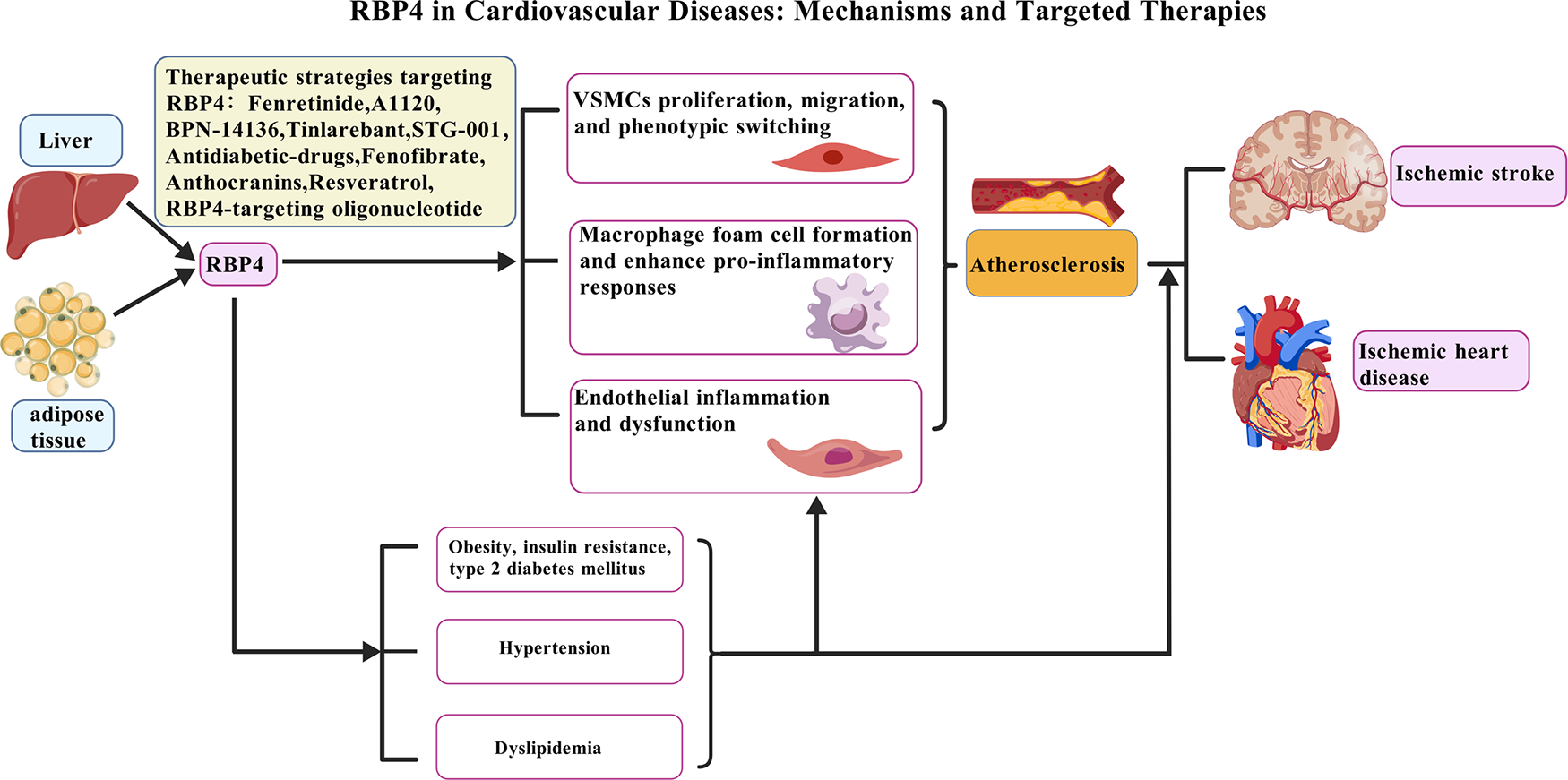 In summary, RBP4 contributes to AS through a tripartite mechanism: (a) inducing ECs inflammation and dysfunction, (b) stimulating VSMC proliferation, migration, and phenotypic switching, and (c) enhancing macrophage foam cell formation and pro-inflammatory responses within plaques. Although research on the relationship between RBP4 and AS continues to evolve, current evidence strongly supports its role in facilitating AS onset and progression. These findings highlight the potential of RBP4 as a dual-purpose diagnostic marker and therapeutic target, which may inform novel clinical strategies. Nevertheless, the precise molecular mechanisms and downstream signaling pathways mediated by RBP4 in AS remain incompletely understood. Future studies should therefore prioritize elucidating these mechanisms to fully clarify the pathogenic role of RBP4 in AS.