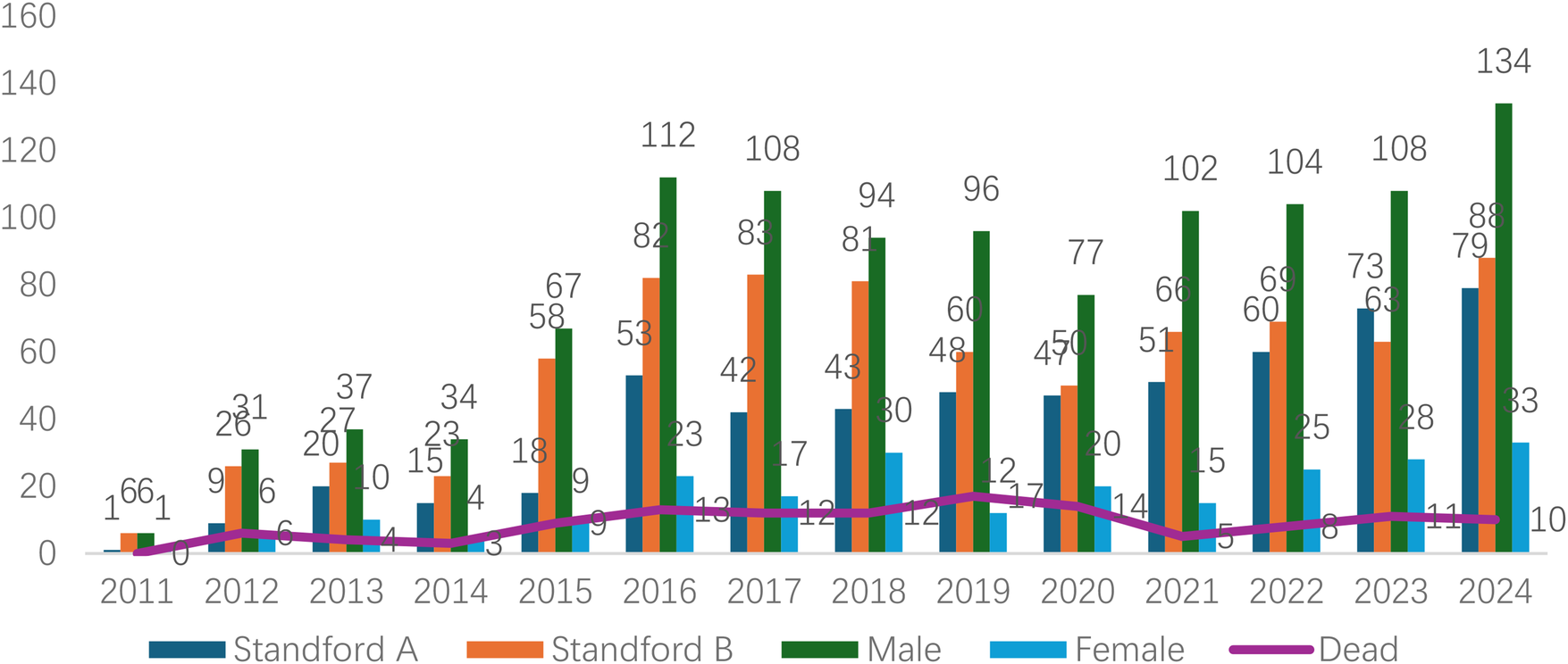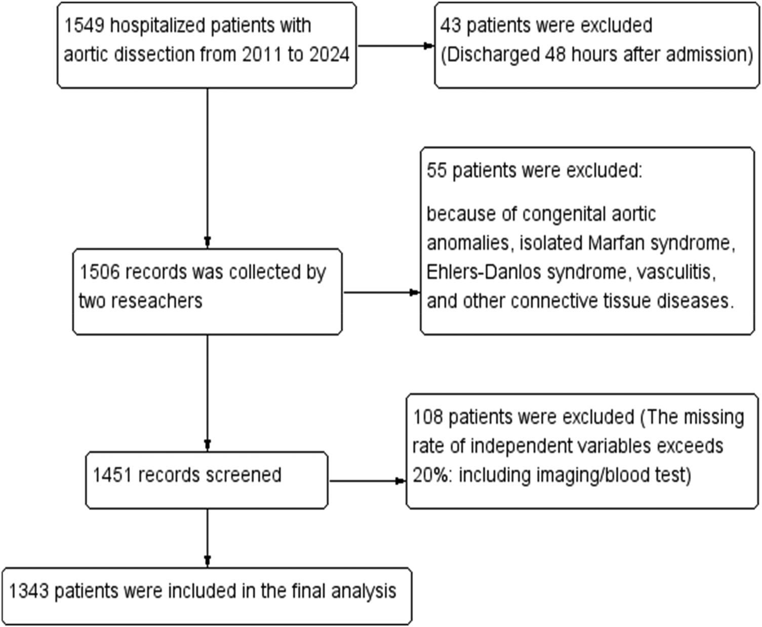 Aortic dissection (AD) is a highly lethal cardiovascular emergency, with a globally increasing incidence in recent years. The epidemiological characteristics of AD in the Chinese population differ significantly from those in Western countries, manifesting as an earlier onset age (approximately 10 years younger on average), a higher prevalence but poorer control of hypertension, and more prominent risk factors such as smoking (1–3). Large-scale studies indicate that uncontrolled hypertension can double the risk of AD (4, 5). However, large-sample studies detailing the evolution of clinical characteristics and their association with outcomes in domestic AD patient populations remain relatively scarce. Regarding prognosis, in-hospital mortality for AD remains high (6). Internationally, risk assessment scoring systems like German Registry for Aortic Dissection type A score exist (7), but their applicability in the Chinese population requires further validation. Most current domestic studies have not comprehensively integrated demographic characteristics, clinical manifestations, and imaging data (e.g., Stanford classification, vascular diameters) to analyze their combined impact on prognosis. Therefore, this study analyzed complete clinical data from 1,343 AD patients between 2011 and 2024, aiming to detail its epidemiological characteristics and thoroughly investigate key factors influencing in-hospital outcomes, thereby providing evidence-based support for improving the prognosis of AD patients.