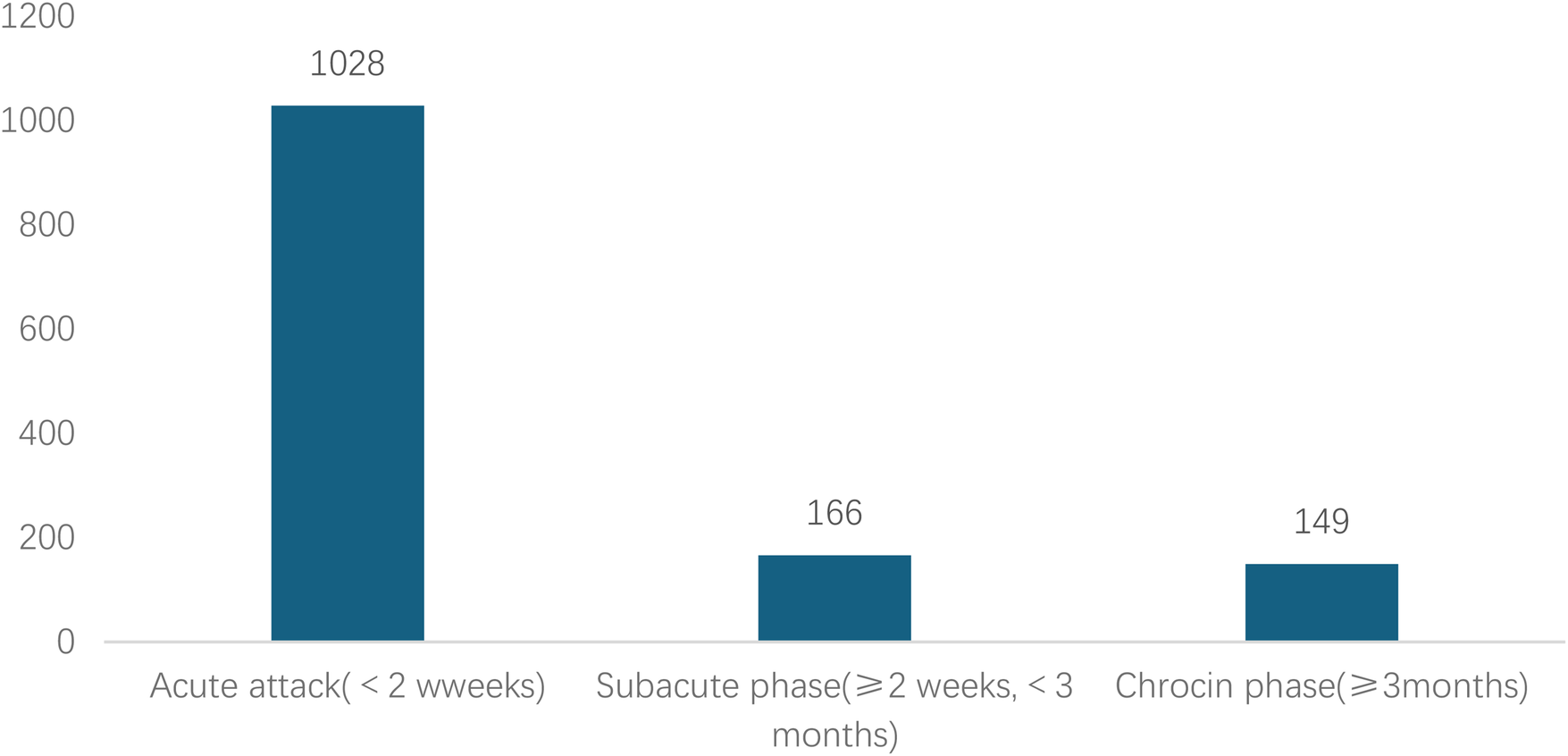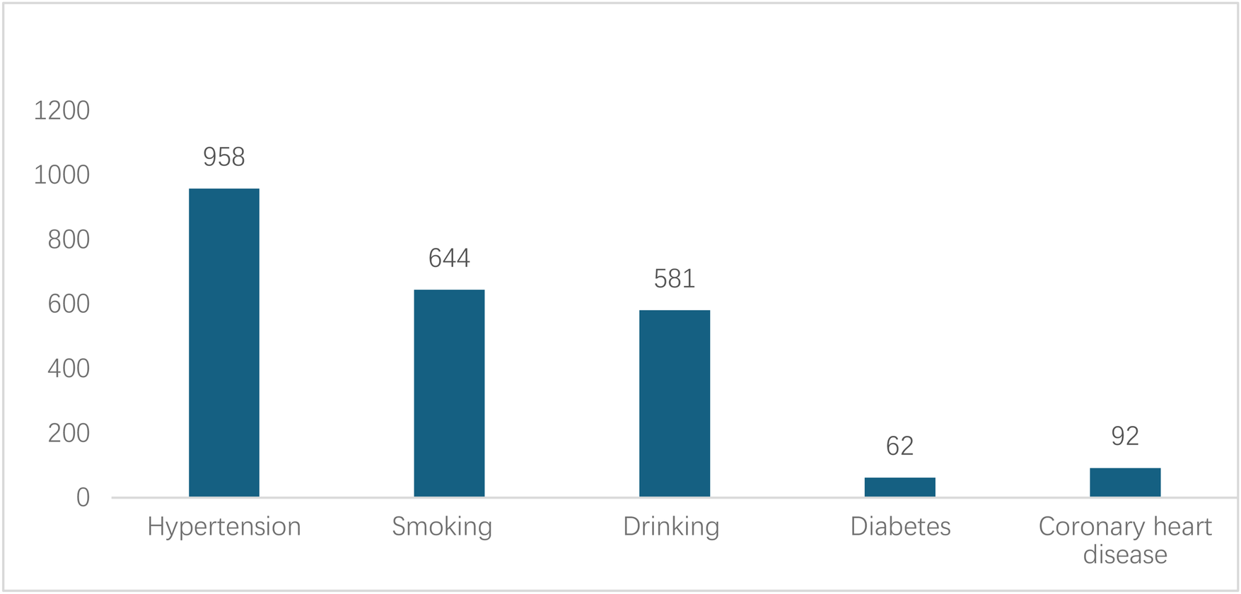 A total of 1343 eligible cases were included, comprising 1110 males and 233 females (male-to-female ratio 4.76:1), with a mean age of 52.7 ± 12.4 years. On admission, 958 patients (71.3%, 95% CI: 68.8%–73.7%) had hypertension; 62 (4.6%) had diabetes mellitus; 644 (48.0%) had a history of smoking; 581 (43.3%) had a history of heavy smoking; and 92 (6.9%) had coronary artery disease (Figure 2). The proportions of Stanford type A and B AD were 41.7% and 58.3%. Age (t = −4.516, P < 0.001), hypertension (χ² = 14.828, P < 0.001), and diabetes (χ² = 4.289, P = 0.038) were significantly associated with Stanford classification. Smoking (χ² = 1.907, P = 0.167) and alcohol consumption (χ² = 3.390, P = 0.079) showed no significant statistical association with Stanford classification (Table 1).