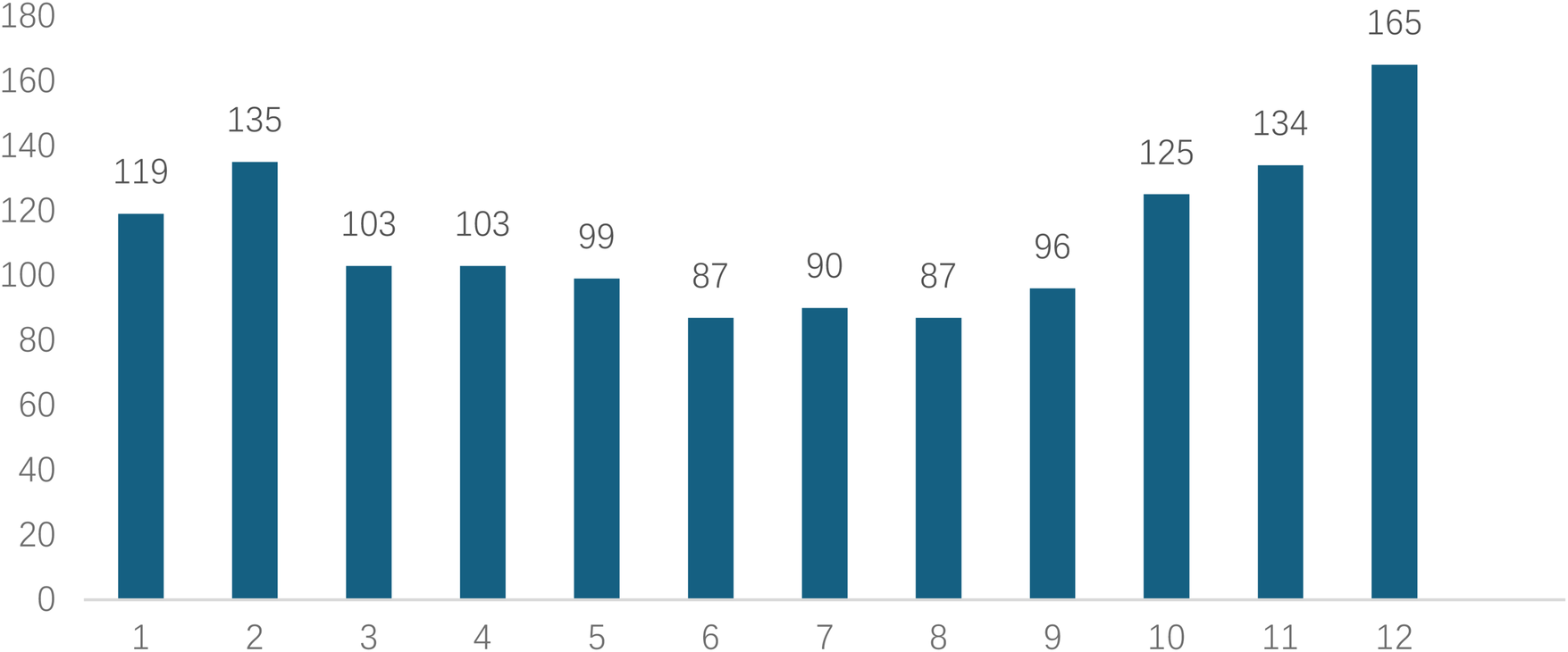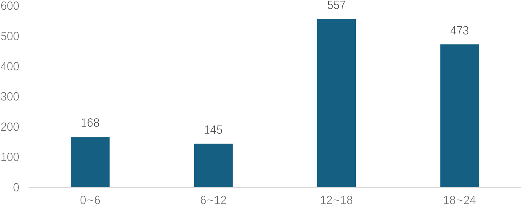 Analyzed in 5-year intervals: The overall number of AD cases showed an increasing trend from 2010 to 2024, with growth trends observed from 2011 to 2015 and 2021 to 2024, and a slight decline from 2016-2020. The overall mortality rate was maintained below 10% (Figure 3). Mortality rates were 16.9% for type A and 4.0% for type B dissections. The readmission rate post-AD surgery was 7.4% (87/1163). The majority of AD patients presented with acute onset 76.5% (Figure 4). Regarding presenting symptoms, chest pain was most frequent (892, 66.4%), followed by abdominal pain (Figure 5). AD incidence showed a tendency towards winter and spring seasons, peaking in December (Figure 6). The emergency department admitted the highest number of AD patients between 12:00 and 23:00 daily, accounting for 76.6% of all hospitalized cases (Figure 7). Current AD treatments broadly include conservative medical management, endovascular intervention, and open surgical repair. The number of endovascular interventions has steadily increased, accounting for 62% (701/1130) of the 1130 patients who underwent procedures (Figure 8).