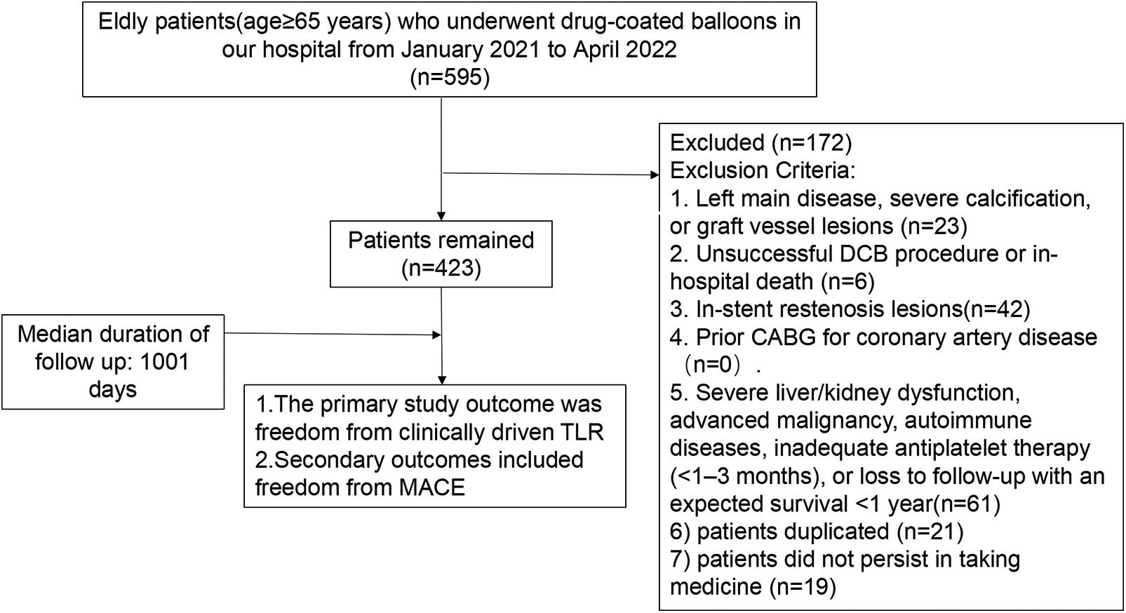 This retrospective observational study enrolled 423 elderly patients (aged ≥65 years) with de novo coronary artery lesions who underwent drug-coated balloon (DCB) treatment between January 2021 and June 2022. The inclusion criteria comprised meeting the indications for DCB treatment (14), achieving a TIMI flow grade of III post-angioplasty without type C or higher dissection, lesions amenable to complete coverage by a single DCB, and the availability of comprehensive clinical data. Key exclusion criteria included left main disease, severe calcification, or graft vessel lesions; an unsuccessful DCB procedure or in-hospital mortality; in-stent restenosis lesions; a history of CABG; severe liver/kidney dysfunction, advanced malignancy, autoimmune diseases, inadequate antiplatelet therapy (<1–3 months), loss to follow-up, or an expected survival of less than one year. The study protocol was approved by the Ethics Committee of the Affiliated Hospital of Xuzhou Medical University (Approval No.: XYFY2022-KL242-01). This study is an unregistered retrospective study and included a data availability statement. The flow chart for this study is shown in Figure 1.