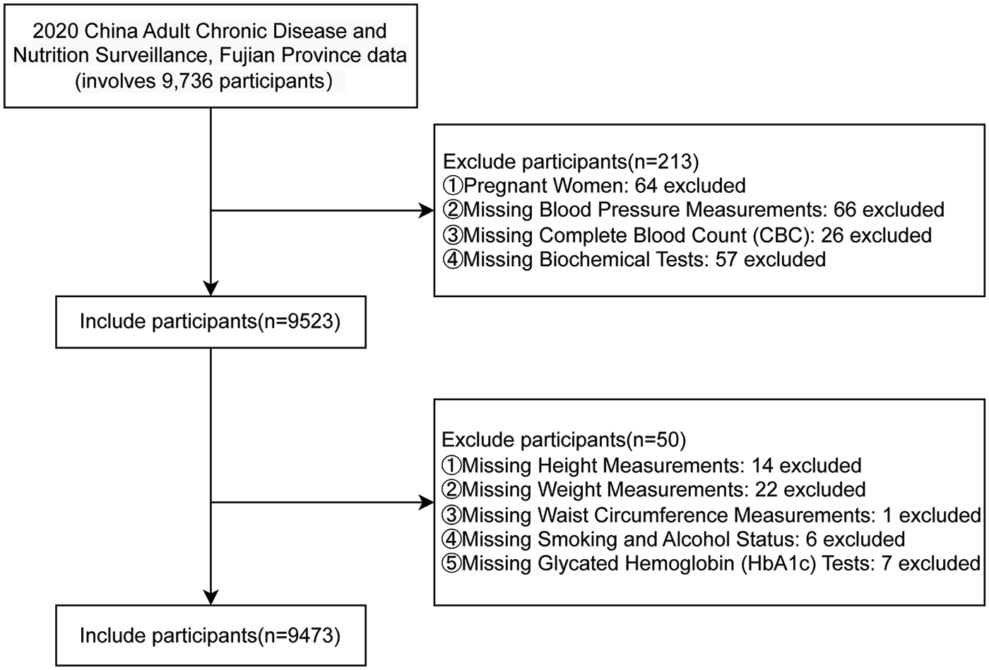 The data were obtained from the Fujian Provincial Surveillance Site of the China Cardiovascular Disease and Risk Factors Surveillance Program, a cross-sectional study jointly conducted by the National Center for Cardiovascular Diseases and the First Affiliated Hospital of Fujian Medical University from August 2020 to April 2021. This study enrolled permanent residents aged ≥18 years with ≥6 months of local residency in Fujian Province, China. A stratified multistage random sampling method was employed to select a provincially representative sample for assessing the prevalence of major cardiovascular diseases. All participant information was systematically collected through standardized face-to-face surveys by well-trained examiners, comprising three principal components: questionnaire surveys, physical examinations, and laboratory assessments. Laboratory tests included the collection of fasting blood and urine specimens for the measurement of multiple indicators. After cryopreservation and cold-chain transportation, complete blood count was tested locally, while the remaining biochemical indicators were uniformly tested in a designated laboratory to ensure comparability. Specifically, this study utilized comprehensive data from 9,736 individuals in the Fujian Provincial Surveillance Site during the 2020–2021 period. Following a rigorous screening process, 9,473 participants met the stringent inclusion criteria for final analysis. Figure 1 presents a detailed flowchart outlining the participant selection procedure for this study.