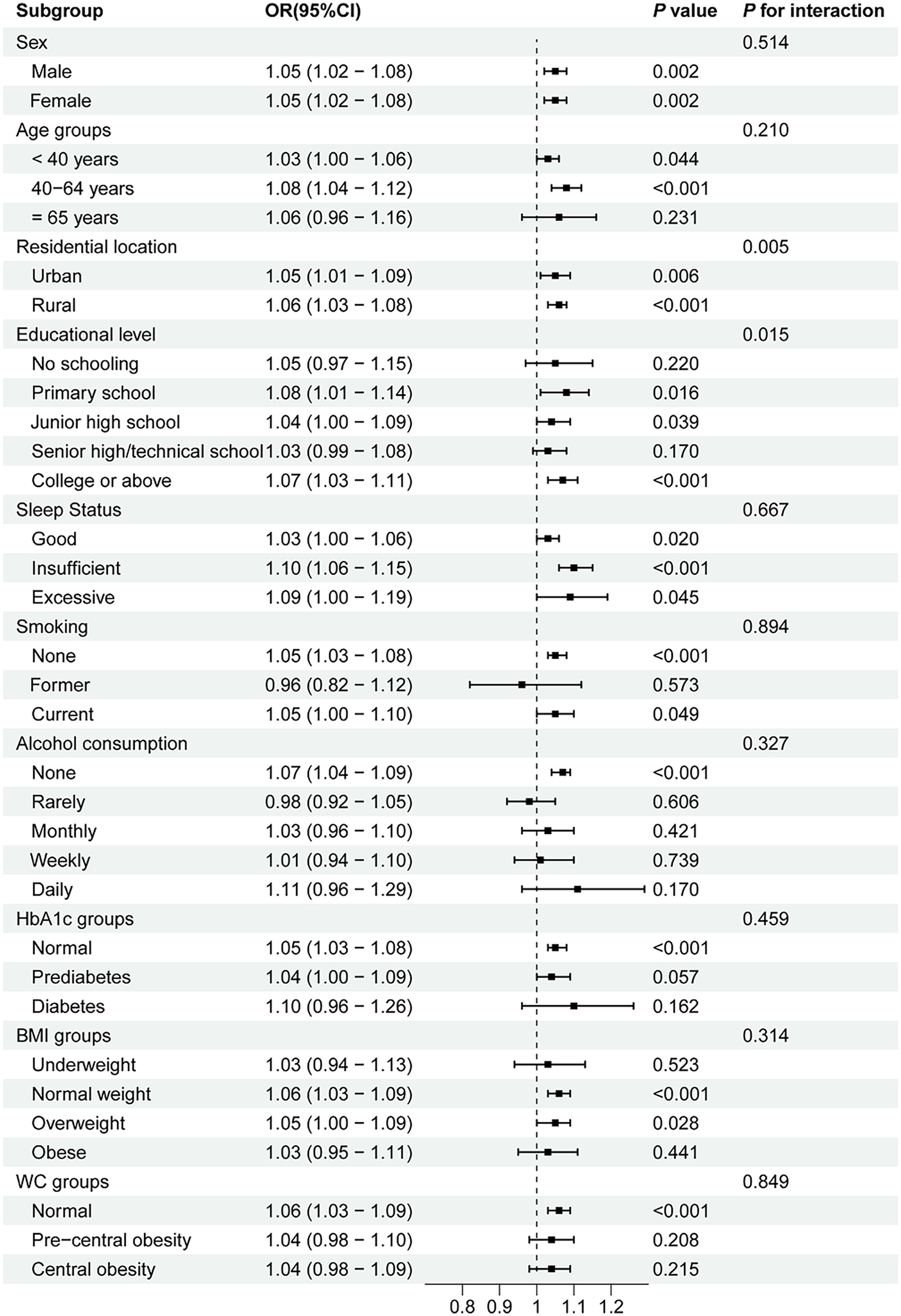 Based on the quartiles of the AIP, all study participants were categorized into four groups. Normally distributed continuous variables were presented as mean ± standard deviation (SD), with group comparisons made using one-way ANOVA. Non-normally distributed continuous variables were presented as median (interquartile range, IQR), with group comparisons made using the Kruskal–Wallis H test. Categorical variables were presented as number (percentage), and group comparisons were performed using the chi-square test. The generalized variance inflation factor (GVIF) was applied to assess multicollinearity among covariates. All variables showed acceptable collinearity, with GVIF^[1/(2 × Df)] values below 2. The proportional odds assumption for ordinal logistic regression was evaluated using the Brant test. Given the violation of this assumption, multinomial logistic regression was applied in subsequent analyses. Three models were utilized in this study: Model 1 was adjusted for sex and age groups; Model 2 was adjusted for Model 1 + sociodemographic factors (residential location, education levels, per capita annual household income, and marital status) and lifestyle factors (sleep status, smoking, alcohol consumption, and physical activity); Model 3 was adjusted for Model 2 + anthropometric measures (BMI groups and WC groups) and laboratory parameters (HbA1c groups, TC, Cr, and UA). The results from the logistic regression analysis were presented as ORs and 95% confidence intervals (CIs). Subgroup analyses were conducted to evaluate potential effect modifications in the associations between the AIP and prehypertension/hypertension by sex, age groups (<40, 40–64, and ≥65 years) (46), BMI groups, smoking, alcohol consumption, residential location, sleep status, and HbA1c groups. Likelihood ratio tests were employed to assess statistical interactions between the AIP and stratification variables.