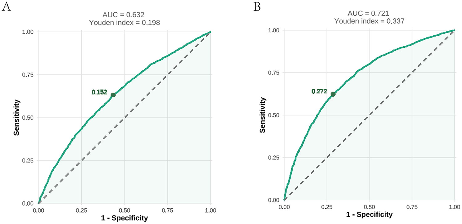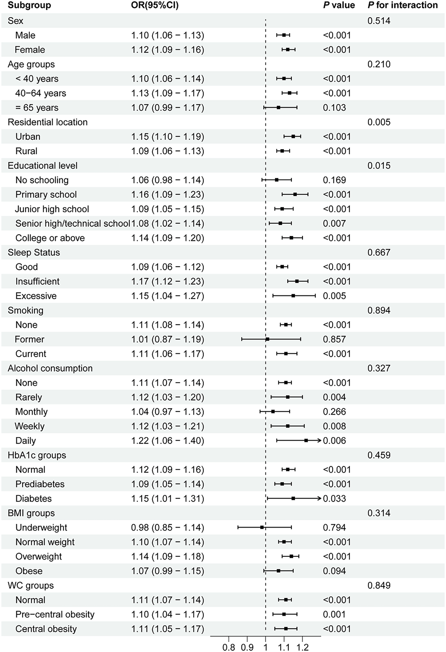 In this study, potential covariates were selected a priori based on existing literature and clinical expertise to comprehensively evaluate their potential influence on the study outcomes. These covariates included sociodemographic characteristics, anthropometric indicators, lifestyle behaviors, and laboratory parameters. Sociodemographic characteristics included sex (male or female), age groups (≥65, 40–64, and <40 years), residential location (urban or rural), education level (no schooling, primary school, junior high school, senior high school or technical school, and college or above), marital status (unmarried, married/remarried/cohabiting, separated, divorced, or widowed), and per capita annual household income (<10,000; 10,000–20,000; 20,000–30,000; 30,000–50,000; 50,000–100,000; or ≥100,000 yuan). Anthropometric indicators included body mass index (BMI), calculated as weight (kg) divided by height squared (m2), and categorized as underweight (<18.5), normal weight (18.5–23.9), and overweight (24.0–27.9), or obese (≥28.0). Waist circumference (WC) was measured horizontally at the midpoint between the iliac crest and the 12th rib along the midaxillary line, recorded to the nearest 0.1 cm at the end of expiration. A WC of <85 cm in men or <80 cm in women was defined as “normal”; 85–89.9 cm in men or 80–84.9 cm in women as “precentral obesity”; and ≥90 cm in men or ≥85 cm in women as “central obesity,” according to the Expert Consensus on the Prevention and Control of Obesity in Chinese Adults (44). Lifestyle factors covered sleep duration [good (7–9 h), insufficient (<7 h), or excessive (>9 h)], smoking status (never, former, or current smoker), alcohol consumption [none, daily (≥1 drink per day), weekly (≥1 drink per week), monthly (≥1 drink per month), or rarely (<1 drink per month)], and physical activity level [insufficient (<150 min/week of moderate-to-vigorous physical activity) or sufficient (≥150 min/week)]. Laboratory parameters included glycated hemoglobin (HbA1c), classified as diabetes (≥6.5%), prediabetes (5.7%–6.4%), or normal (<5.7%) (45); fasting triglycerides (TG); total cholesterol (TC); low-density lipoprotein cholesterol (LDL-C); high-density lipoprotein cholesterol (HDL-C); serum creatinine (Cr); and uric acid (UA). Blood biochemical parameters, including HbA1c, TC, TG, HDL-C, LDL-C, Cr, and UA, were measured using a Beckman AU680 analyzer. HbA1c was determined by high-performance liquid chromatography; oxidase methods were used for TC and TG; direct methods were applied for HDL-C and LDL-C; and the enzymatic method was used for Cr and UA.