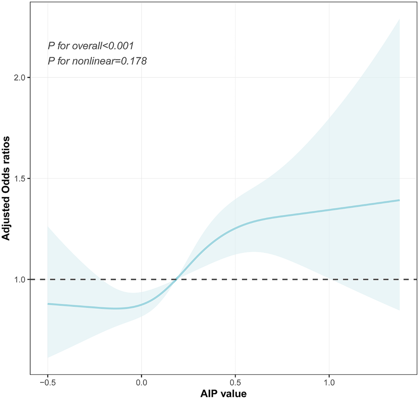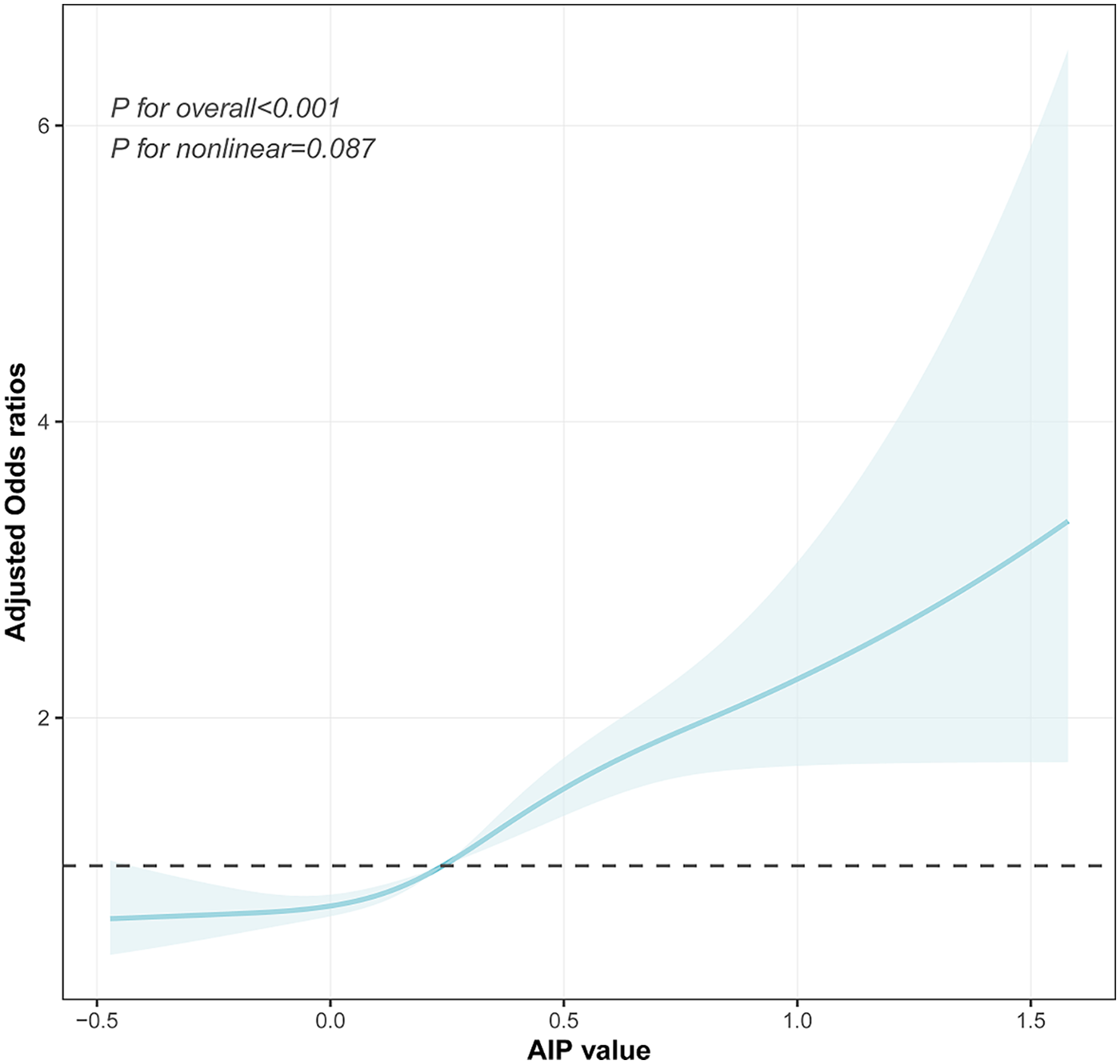 The AIP was calculated as the logarithmic transformation of the ratio of TG to HDL-C, expressed as AIP = log(TG/HDL-C) (42). Because of its small magnitude, the AIP was multiplied by 10 (AIP × 10) when calculating the odds ratios (ORs) for continuous variables in this study (43).