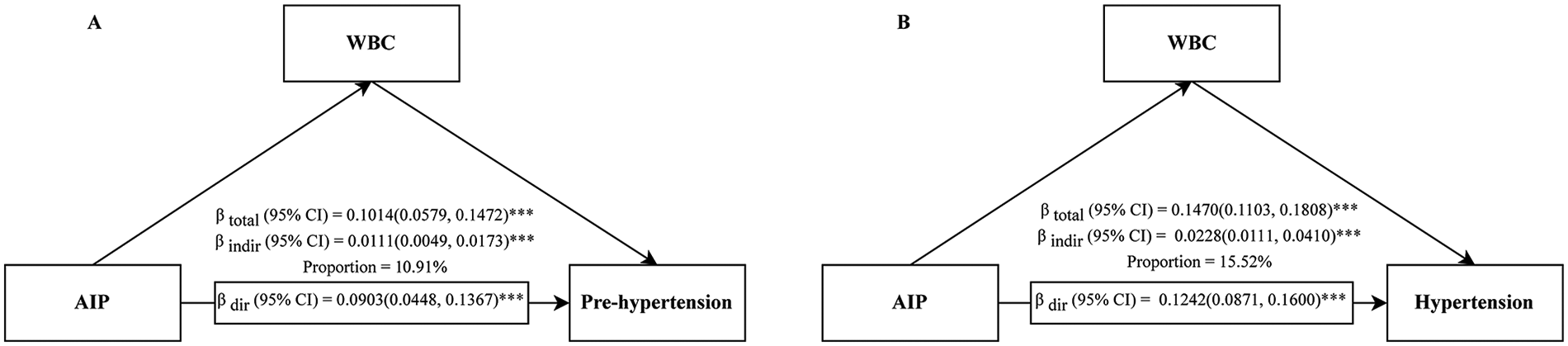 A total of 9,473 adults were included in the final analysis, including 3,273 diagnosed with prehypertension and 3,248 with hypertension. Overall, participants with elevated AIP levels demonstrated higher prehypertension detection rates and hypertension prevalence (all P < 0.05). The multivariate logistic regression model showed that the AIP was significantly positively associated with prehypertension [per 0.1-unit increment in the AIP: odds ratio (OR), 1.05, 95% confidence interval (CI): 1.03–1.07] and hypertension (per 0.1-unit increment in the AIP: OR, 1.11, 95% CI: 1.09–1.14), respectively. Compared with the lowest quartile of the AIP, participants in the highest quartile had a higher risk of prehypertension [OR: 1.58 (1.32, 1.90)] and hypertension [OR: 2.30 (1.86, 2.84)]. No evidence of a non-linear association was observed between the AIP and the risk of prehypertension (Pnon-linear = 0.178) or hypertension (Pnon-linear = 0.087). There were significant interactions between the AIP and both residential location and educational level regarding the risk of blood pressure classification (Pinteraction < 0.05). Furthermore, an ROC analysis indicated a higher clinical predictive value of the AIP for hypertension (AUC = 0.721, 95% CI: 0.708–0.734). White blood cell count mediated 10.91% and 15.52% of the total effect of the AIP on prehypertension and hypertension, respectively.