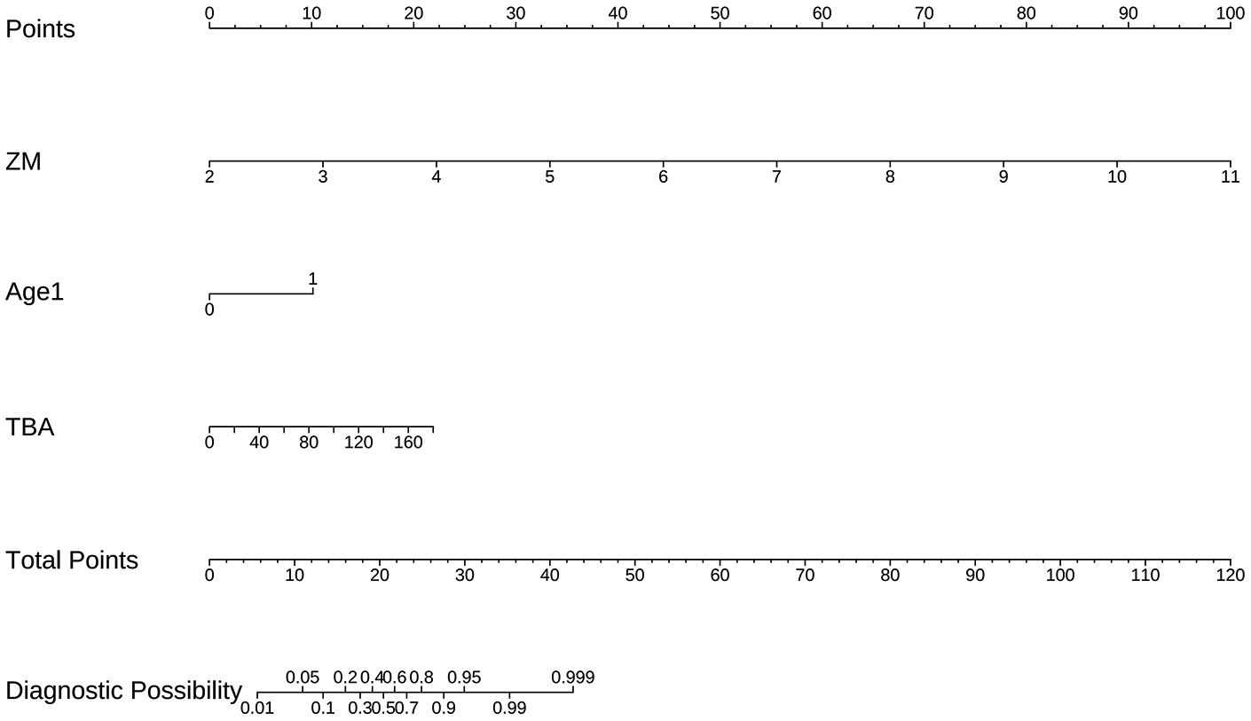 Continuous variables were tested for normality using the Shapiro–Wilk test. Normally distributed data are presented as mean ± standard deviation and compared using the unpaired Student's t-test; non-normally distributed data are presented as median (interquartile range) and compared using the Mann–Whitney U-test. Categorical variables are presented as number (percentage) and compared using the χ2 test or Fisher's exact test. Internal validation was performed using 1,000 bootstrap resamples (12). Predictor selection employed LASSO regression (13) combined with bootstrap stability selection. A multivariate logistic regression model was built using the selected predictors, and odds ratios (ORs) with 95% confidence intervals (CIs) were calculated. The model's discrimination, calibration, and clinical utility were evaluated using the area under the receiver operating characteristic (ROC) curve, calibration plots, and decision curve analysis (DCA) It should be noted that the predictor data were largely complete. Specifically, white blood cell count (WBC) was missing in 5 cases (3.7%), and NT-proBNP was missing in 7 cases (5.2%). Data for total bile acids (TBA) and all other variables were fully available, with all missing proportions well below the 20% exclusion criterion. These limited missing data were handled using multiple imputation by chained equations (14). All analyses were performed using R software (version 4.2.2). A two-sided P-value < 0.05 was considered statistically significant.