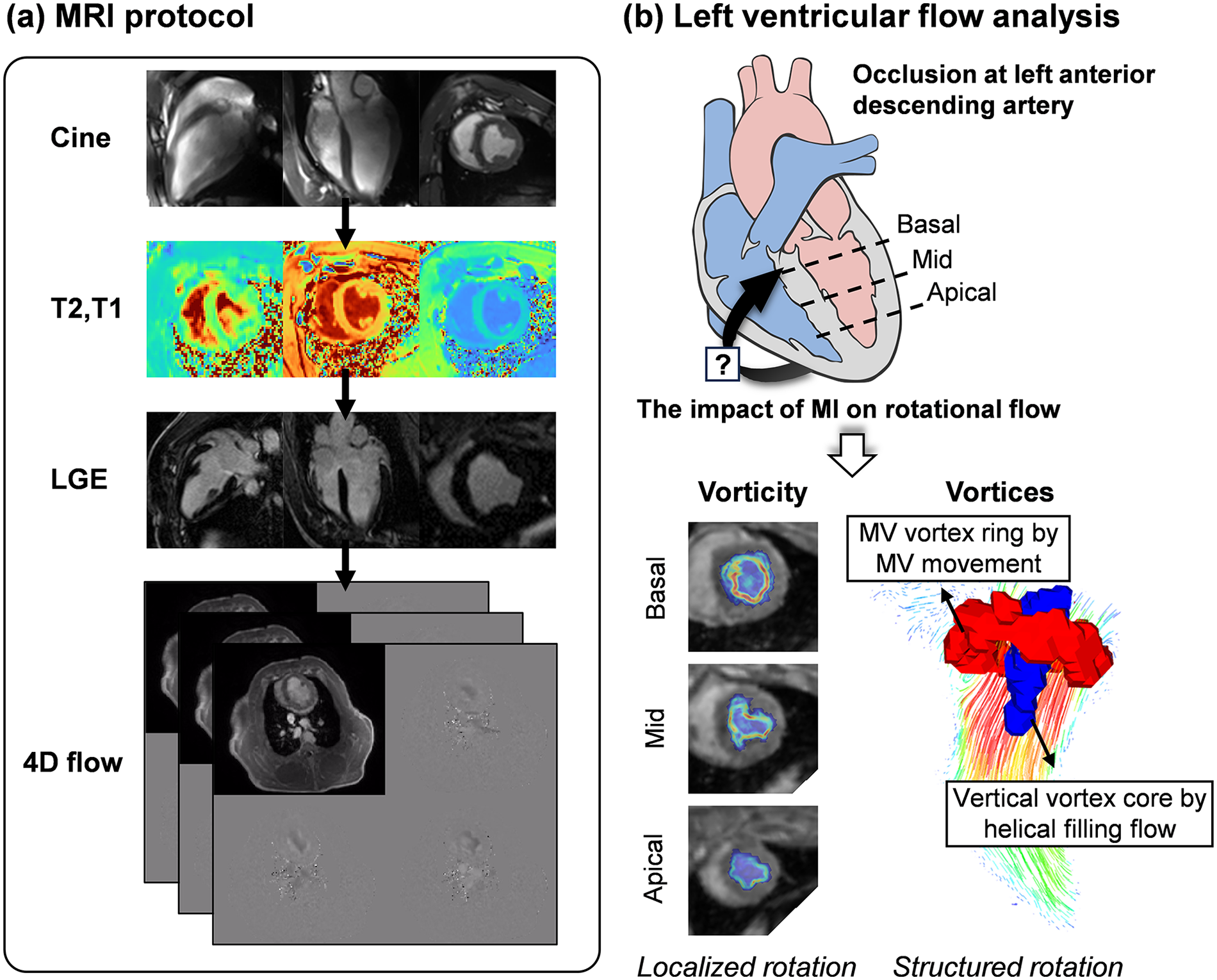 Overview of the study. (a) The MRI protocol comprised of cine imaging, native T1 and T2 mapping, late-gadolinium-enhancement (LGE) imaging, and 4D flow MRI over an 11-week follow-up period. (b) This study aimed to investigate whether MI at the left anterior descending artery could affect intracardiac rotational flow. Vorticity (local rotational flow) was quantified at the basal, mid, and apical planes, and vortex formation (structured coherent rotational flow) resulting from helical filling flow was evaluated. MI, myocardial infarction; MV, mitral valve. Heart diagram by Patrick J. Lynch (medical illustrator), licensed under CC BY 2.5.