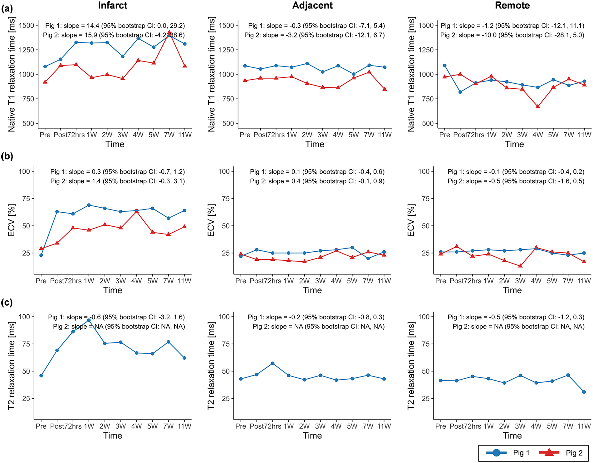 The native T1 relaxation time within the infarct region showed increasing trends over the study timeline in both pig 1 (slope = 14.4, 95% CI: 0.0 to 29.2) and pig 2 (slope = 15.9, 95% CI: −4.2 to 38.6) (Figure 3), whereas ECV and T2 relaxation time exhibited less consistent temporal patterns.