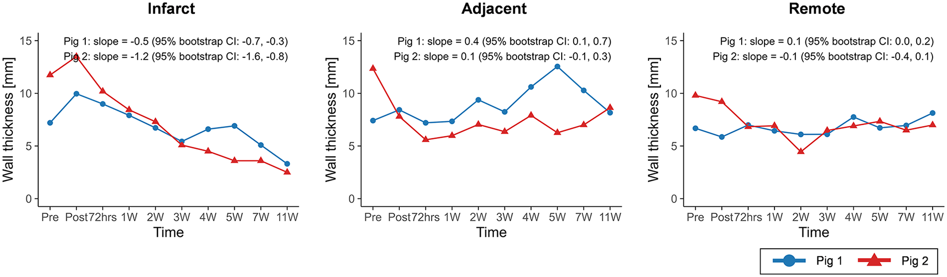 Temporal changes in wall thickness across infarct, adjacent, and remote regions. Temporal trajectories are summarized descriptively, with overall trends characterized using Theil–Sen slope estimates and 95% residual bootstrap confidence intervals. Wall thickness in the infarct region exhibited a consistent decreasing trend over time in both animals.